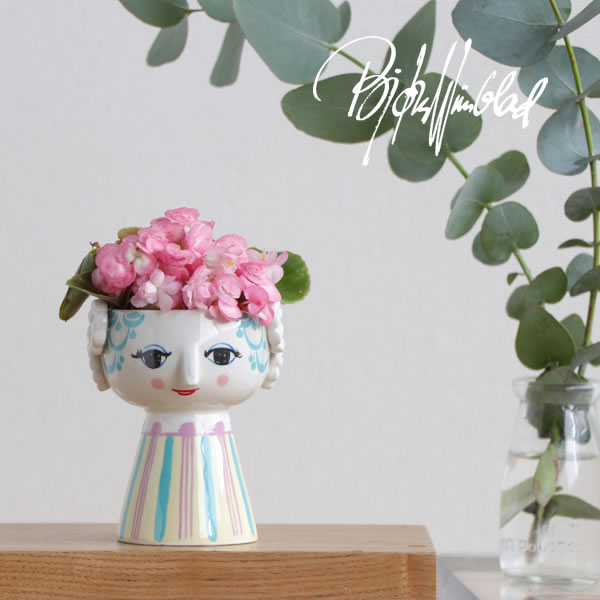 ビヨン・ヴィンブラッドの作品には強い女性像と花のモチーフが多く見られます。アーモンド型の目や三角の鼻を持つ女性の顔は彼のアイコニックな作品の一つで、日常にアクセントを与えてくれます。