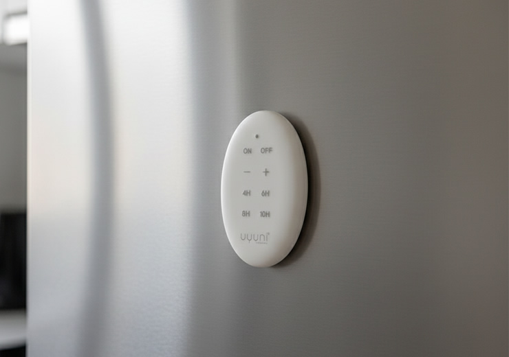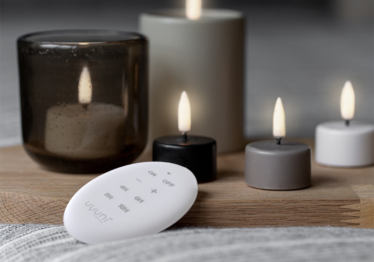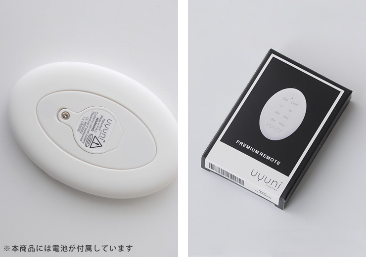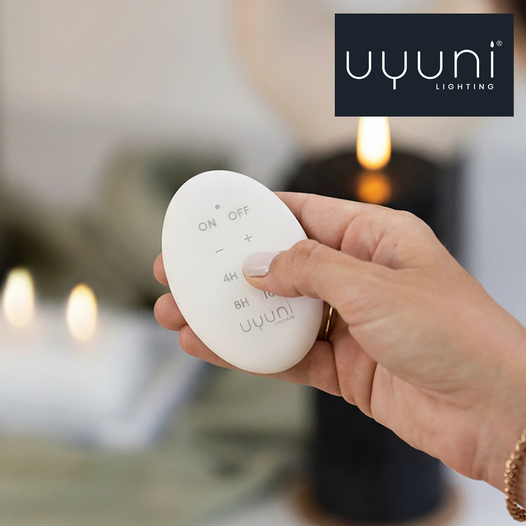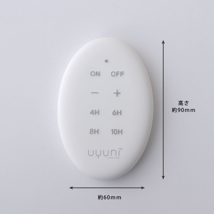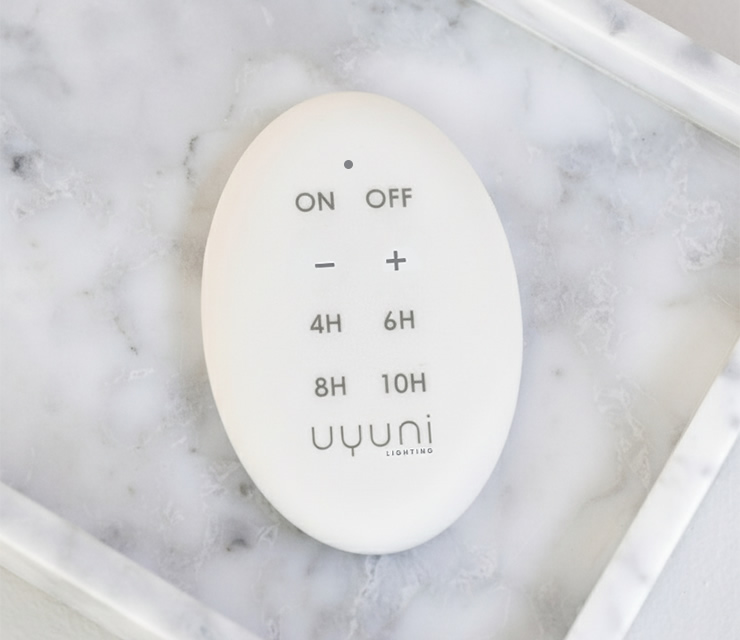 Uyuni 製品にご使用いただけるリモートコントローラー。ボタンを押すだけで簡単にオン・オフを切り替えたり、気分に合わせて明るさを調整することができます。4 時間から 10 時間まで選べる複数のタイマーオプションにより、あらゆるシーンに最適な雰囲気を作り出すことが可能です。