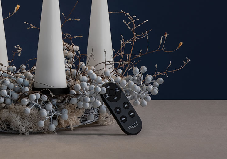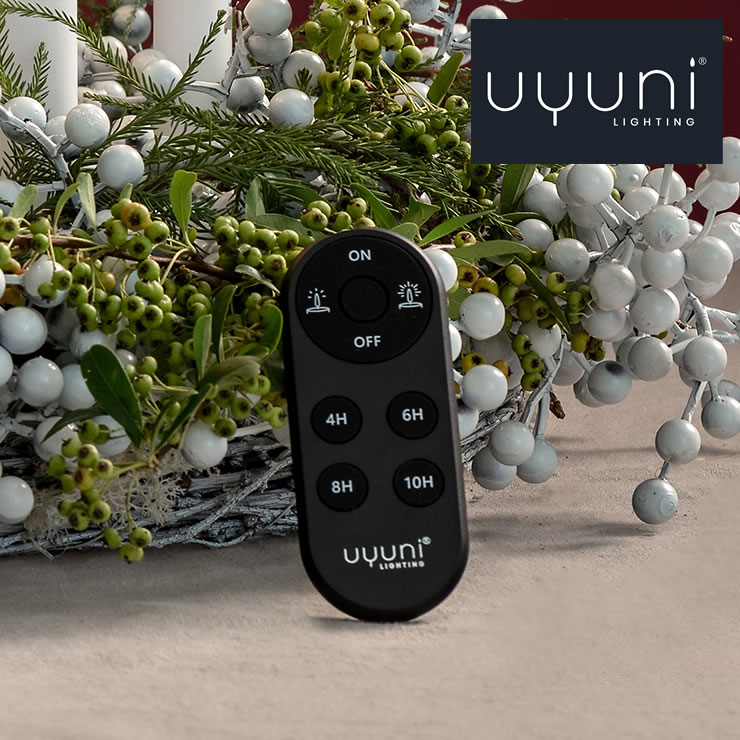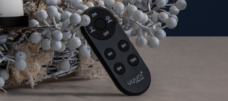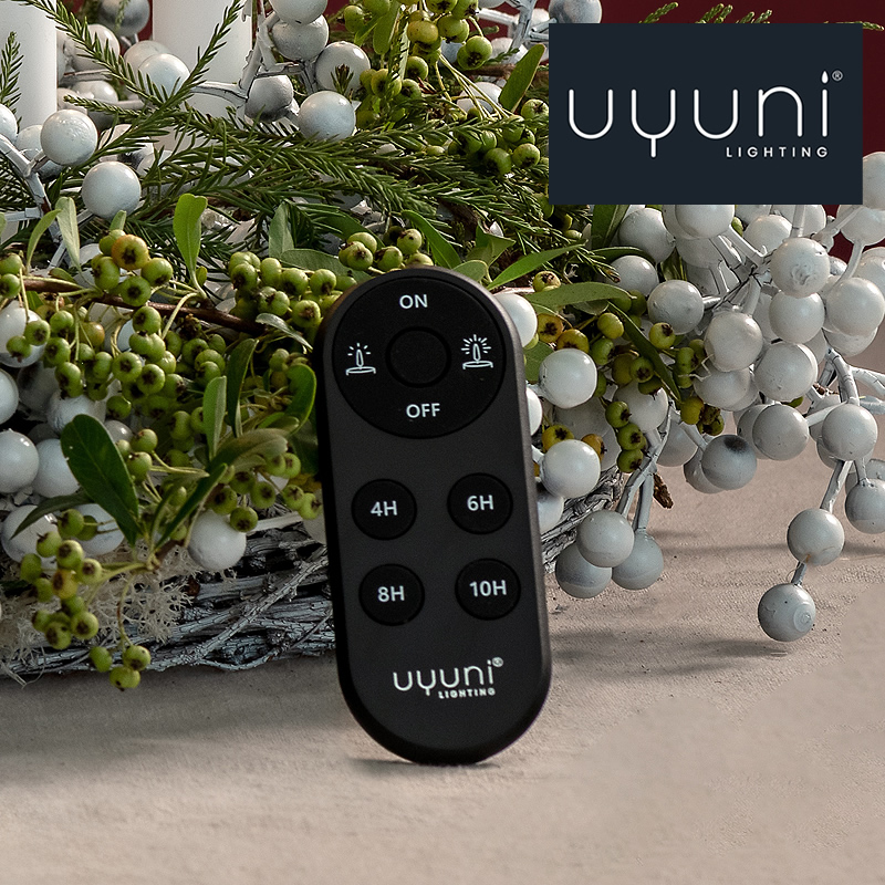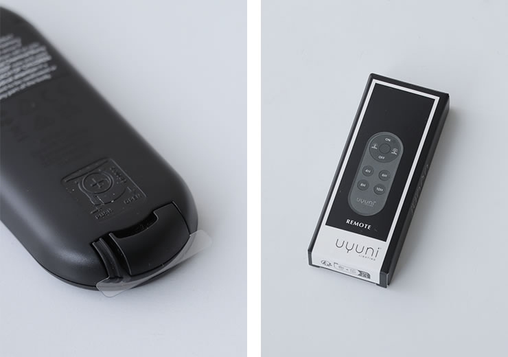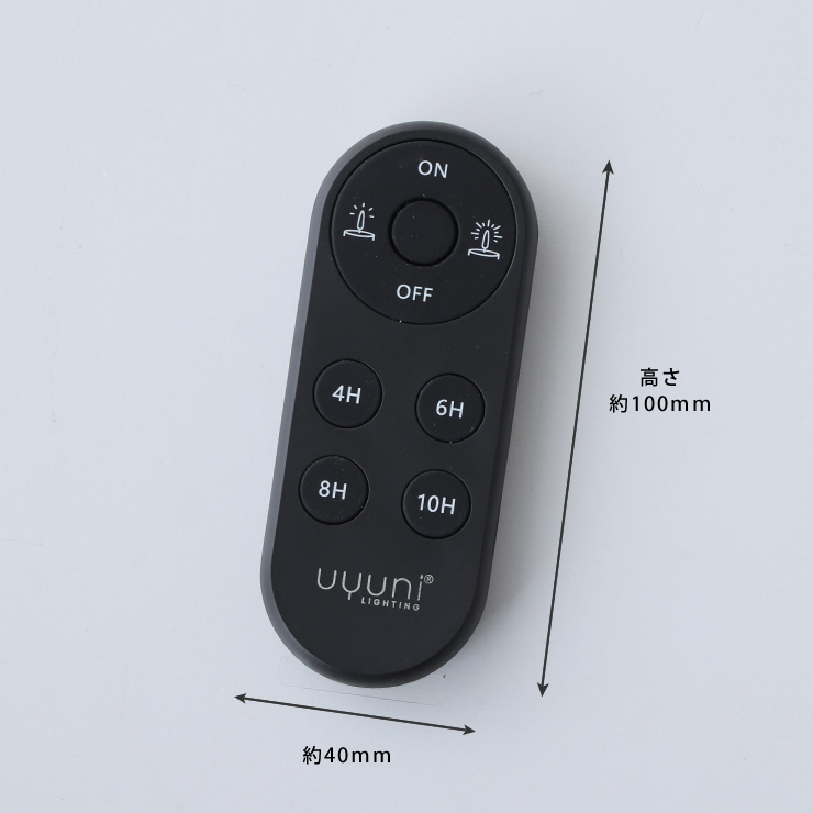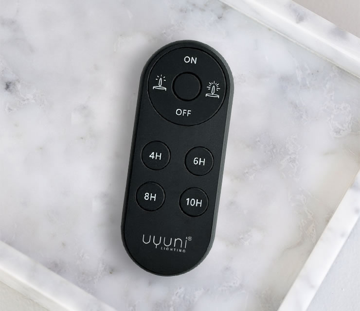 Uyuni 製品にご使用いただけるリモートコントローラー。ボタンを押すだけで簡単にオン・オフを切り替えたり、気分に合わせて明るさを調整することができます。4 時間から 10 時間まで選べる複数のタイマーオプションにより、あらゆるシーンに最適な雰囲気を作り出すことが可能です。
