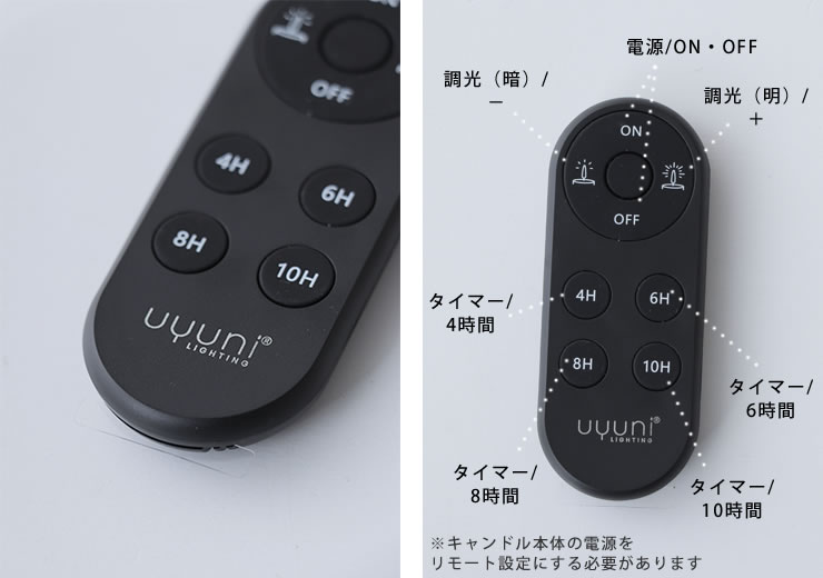 タイマー設定、明るさ調整、そしてキャンドルの ON/OFF を行うことができます。