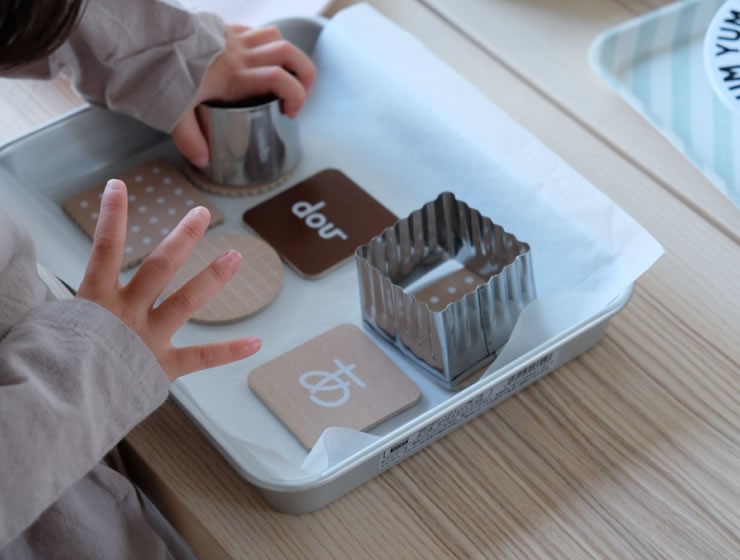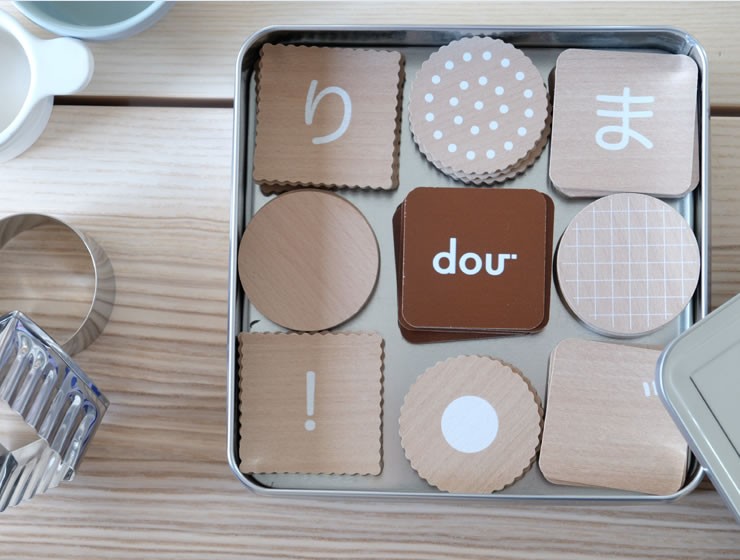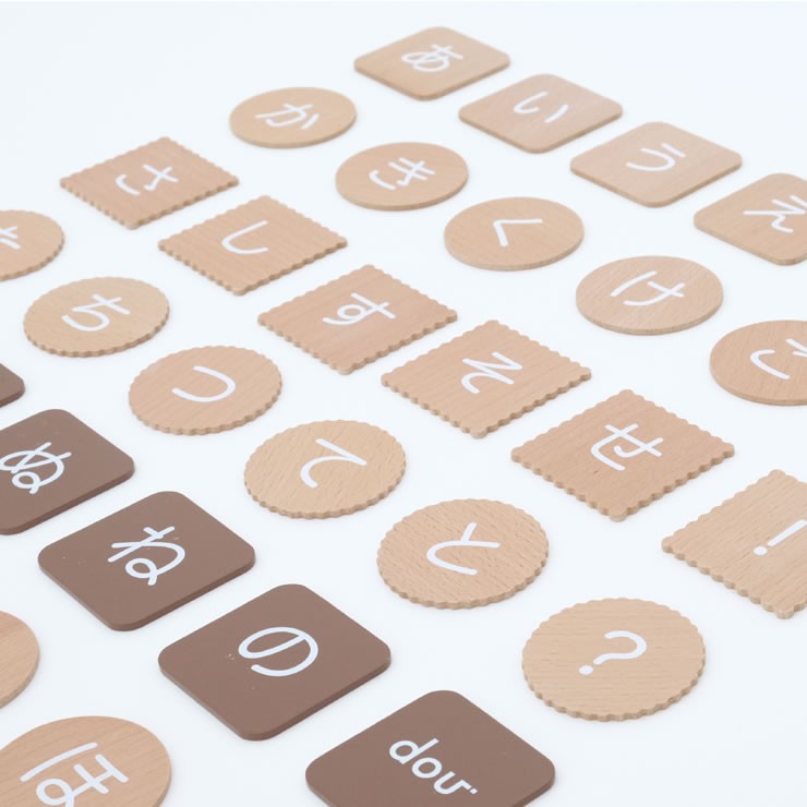 本物のビスケットのように缶に入ったビスケットモチーフのひらがなカード。ひらがなは「わからない、むずかしい」ではなく「楽しい、おもしろい」というイメージにつながるように、子どもたちの大好きなビスケットに文字をのせました。