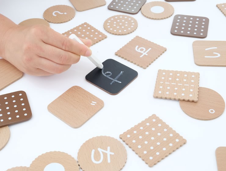 ビスケットの裏が黒板になっているカードが1枚あります。文字を見て書いてみたくなたら練習がすぐにできます。なくした時のためのスペアカードとしても使っていただけます。(※チョークは付属していません)