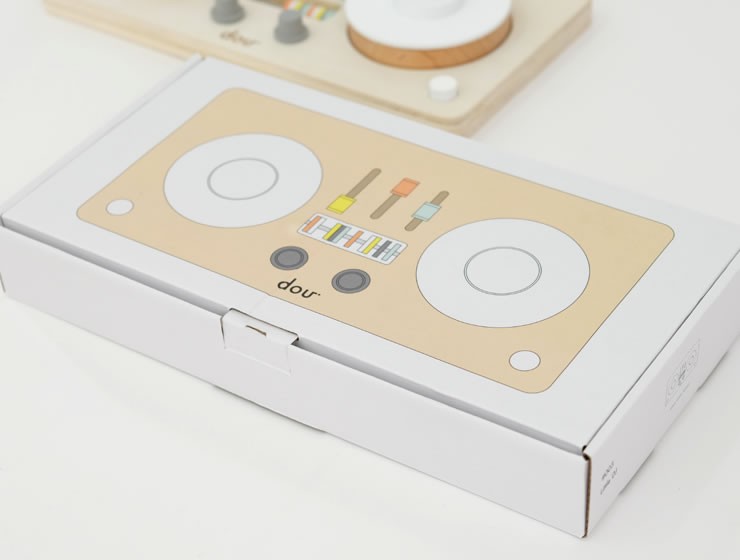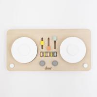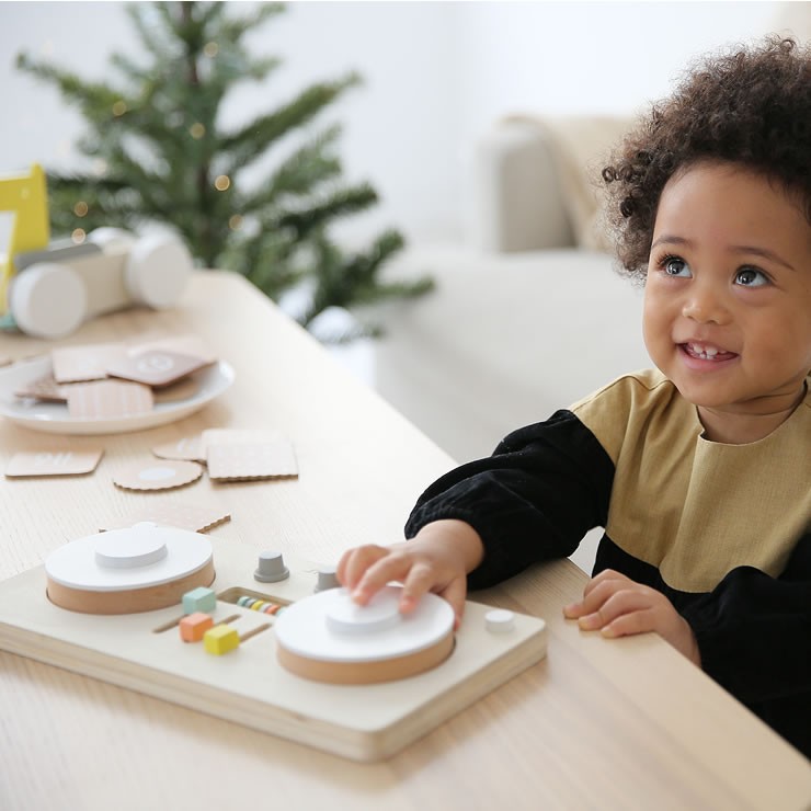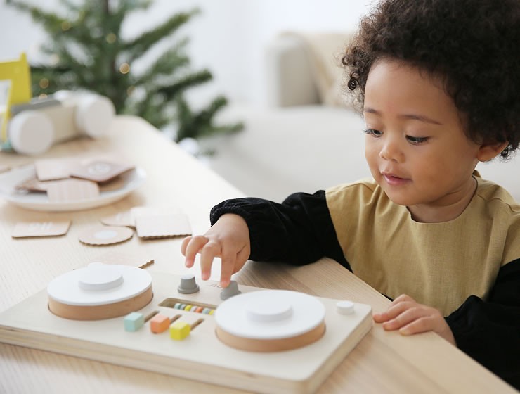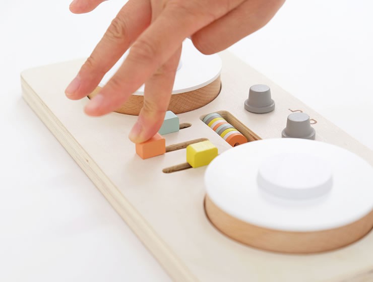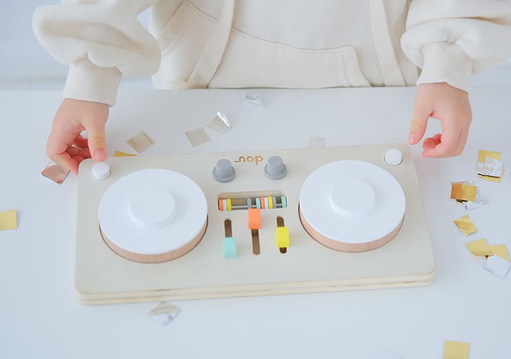 本物のDJのようにターンテーブルをくるくる回すと音がでる楽しいおもちゃ。ダイヤルやスイッチ、そろばんでつまんだり、ひっぱるといった、小さなお子さまの大好きな指先遊びがいっぱい詰まっています。