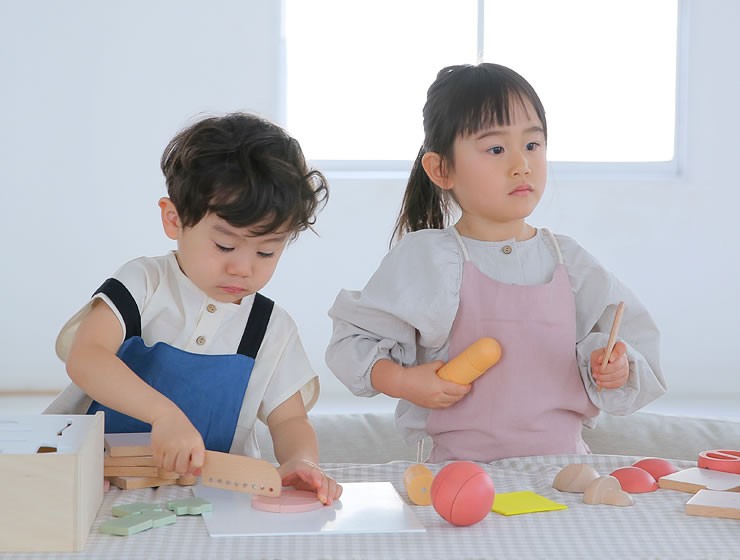 役を演じながら遊ぶことによりコミュニケーション力、表現力そして言語力を育みます。野菜を切ったり、お料理の真似をすることで手先の器用さを身につけることができます。