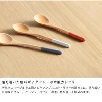 天然木のベージュを基調としたシンプルなカトラリーの端っこに、落ち着いた印象のブルー、オレンジ、ホワイトの差し色が優しく馴染みます。