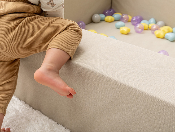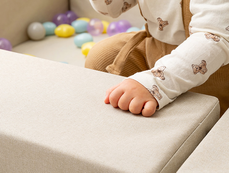 家具やカーテンと合わせやすい、やさしい色のファブリック素材で、まるでお店のような、おしゃれなキッズコーナーをご家庭で再現いただけます。側地が水を弾く素材であるため、汚れを気にせずお使いいただけます。