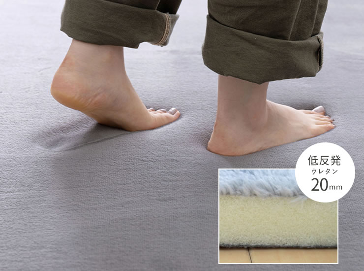 低反発ウレタンを使用し、床の硬さを感じにくい心地よい弾力を実現。しっかりとした厚みと優れたクッション性で、足音などの階下への防音対策としても活躍します。