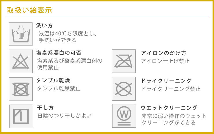 ・お手入れは品質表示にしたがって行ってください。誤ったお手入れは、品質の低下や破損の原因となります