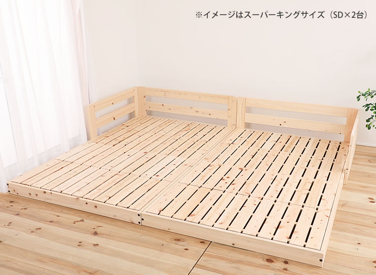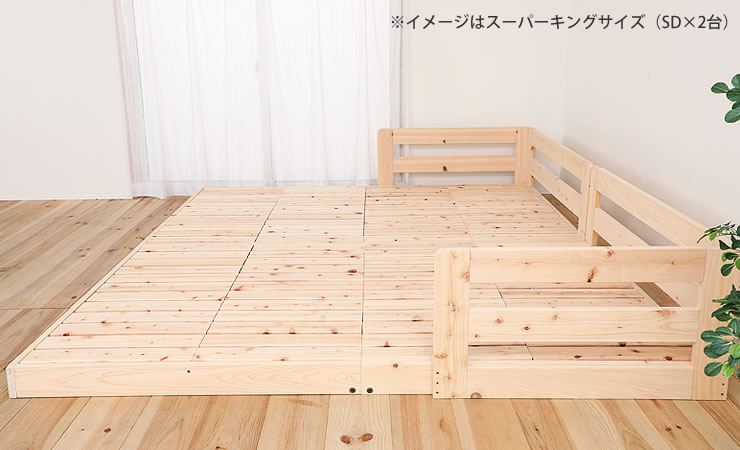 天然ひのきの香りが心地良い国産ひのきをふんだんに使用したすのこローベッド2台セットです。連結・分割出来るので、ベッドを連結してファミリーベッドとしてご夫婦やお子さまと一緒に使ったり、お子さまが成長したら分割して使ったりと、変化するライフスタイルに合わせながら長くお使いいただけます。 床面が低いローベッドはお部屋を広く見せてくれ、小さなお子さま等の転落の危険を軽減してくれます。 ひのき材は無塗装なので本来の風合いと、年を経るにつれて増してくる木の風合いをお楽しみいただけます。 布団のずれや落下を防いで、気持ちよく眠れるサイドガード付き。