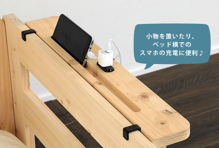 ベッドのサイドフレームに引っ掛けるだけで簡単に取付できます! スマホやタブレットの充電にも便利な一口コンセント付。ベッド横に眼鏡等ちょっとした小物も置けるので、寝室で寛ぐ時間がもっと快適になりますよ♪