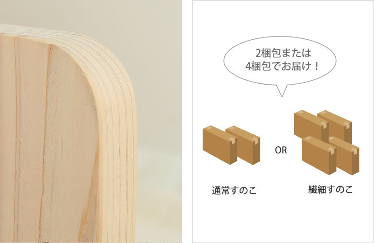 こちらの商品は組み立て式。通常すのこの場合は2梱包、繊細すのこの場合は4梱包でお届けします。