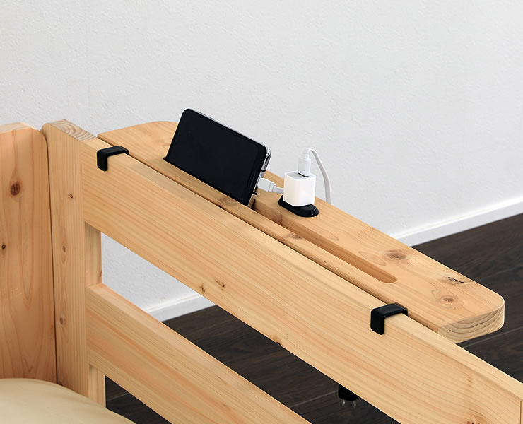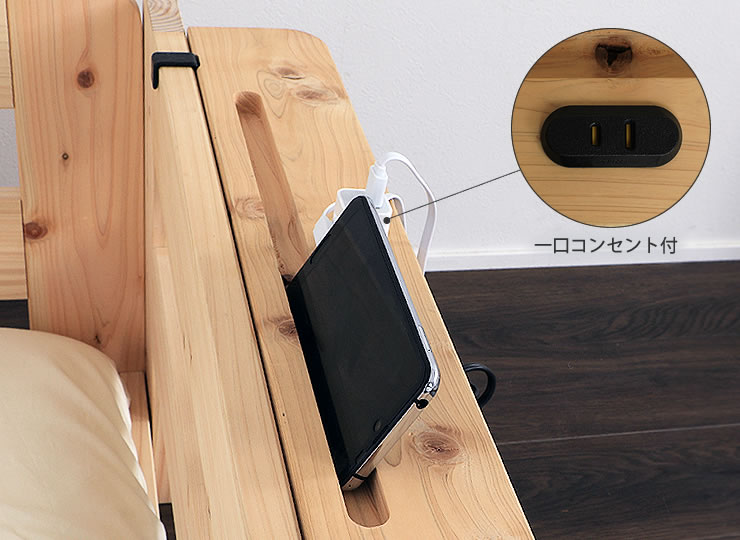 棚の部分にはスマホやタブレットを立てかけるのに便利な溝が付いています。棚の中央には一口コンセントが付いており、ベッド横での充電にも便利です。