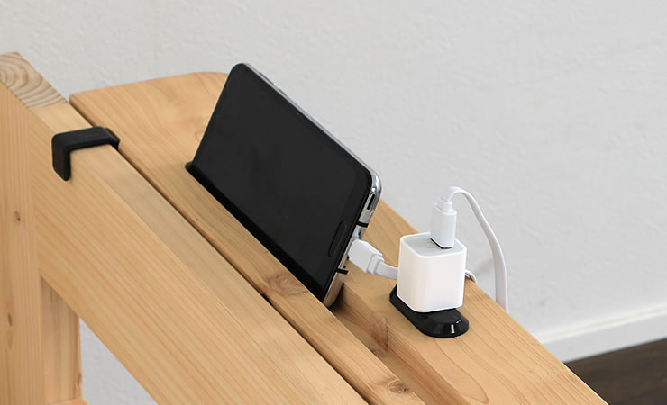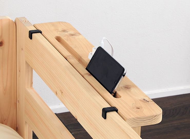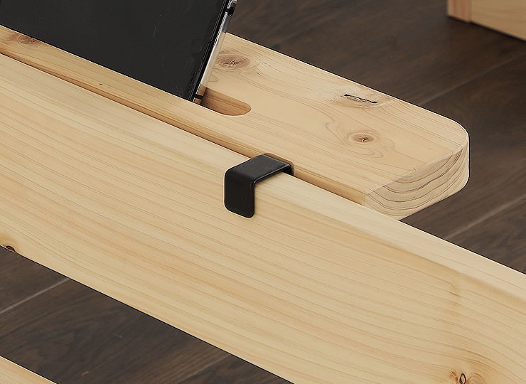 天然ひのきの香りが心地良い国産ひのきを使用したスマホスタンドです。フックをベッドのサイドフレームに引っ掛けるだけで簡単に取付可能。スマホやリモコン、眼鏡や時計などちょっとした小物をベッド横に置きたい時にとても便利です。