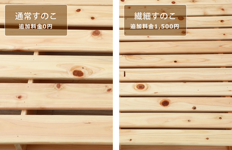 すのこのメリットは、抜群の通気性。湿気を逃すのでカビ問題も安心です。マットレスだけでなく、敷き布団でのご使用にも対応できるよう、すのこを2種類ご用意。ご使用の寝具に合わせて、お好みでお選びいただけます。