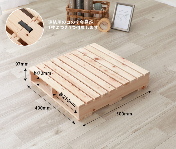 専用連結金具を連結穴に入れるだけで、国産ひのきの香りが心地よいローベッドが完成!縦にも横にも組み合わせられるので、サイズ拡張や使用用途による組み替えも自由自在。分割式なので移動も簡単で、引っ越しや模様替えも楽にできます。空間をすっきり見せたい方や、小さなお子さまやペットがいるご家庭におすすめのすのこベッドシリーズです。