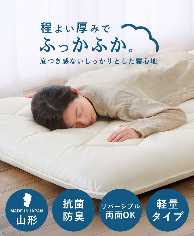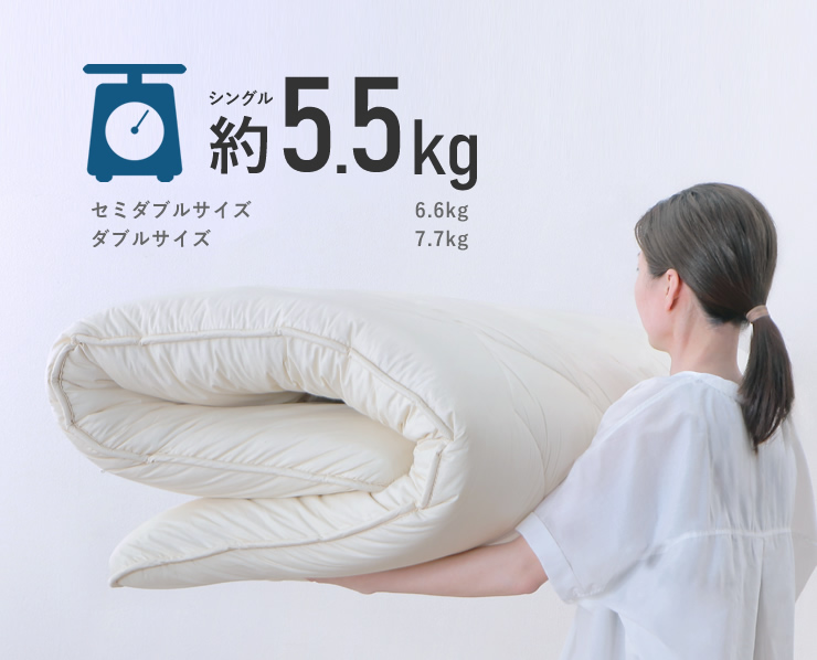 両面使えるリバーシブル仕様で長く品質を保て、軽量設計により毎日のお布団の上げ下げや持ち運びも驚くほど楽々です。