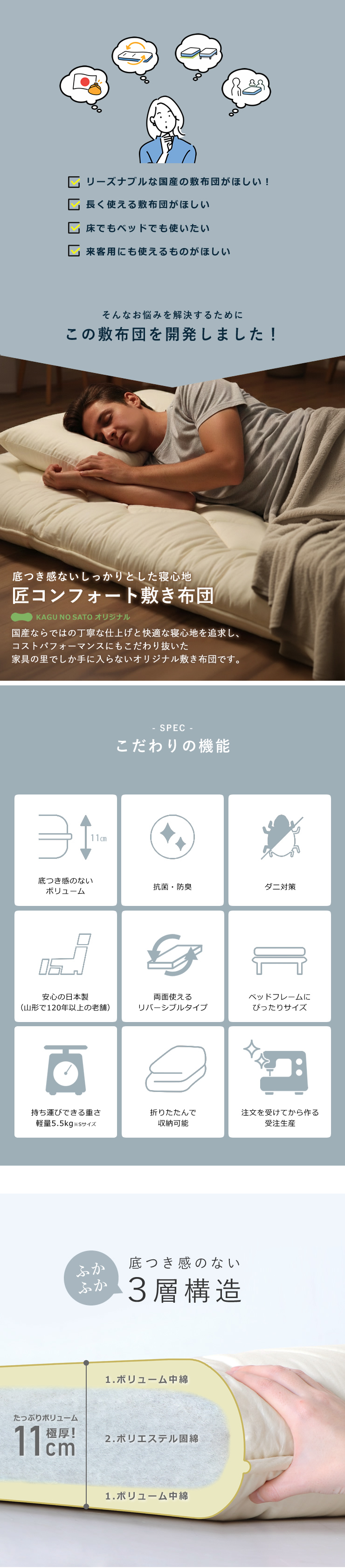 明治39年創業、100年以上の歴史がある山形県のお布団工場で、日本人の眠りをよく知る作り手が、安心して使える日本製の敷布団を仕立てました。