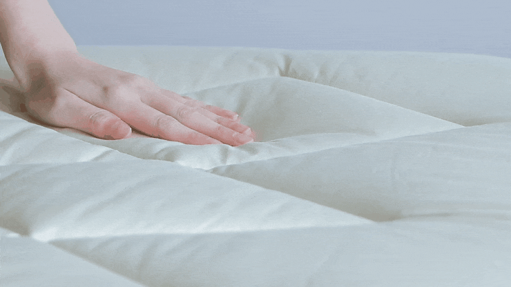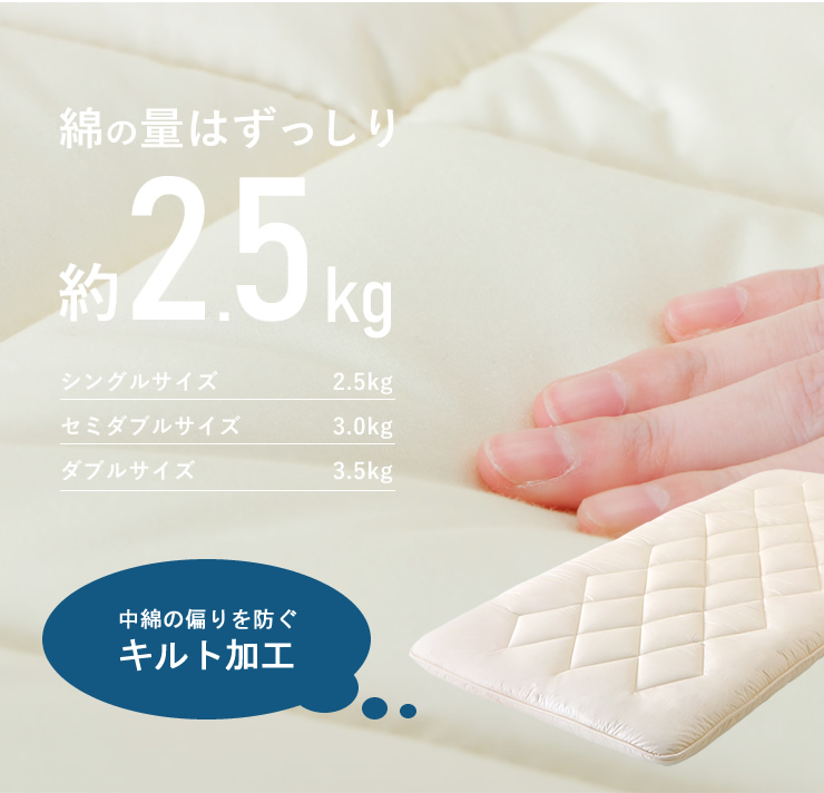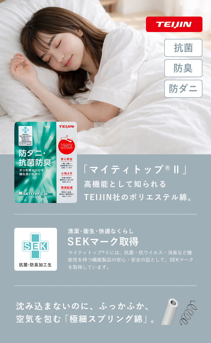 中綿には、帝人マイティトップを配合したボリュームたっぷりの綿を使用。ふんわりとしたやわらかさと程よい弾力を生み出し、体をやさしく包み込みます。中空構造の繊維をスパイラル状にしたマイティトップにより、軽やかなふかふか感と安定した寝心地を両立。さらに表面にはキルト加工を施し、中綿の偏りを防いで、使い続けてもふっくら感が長く続きます。