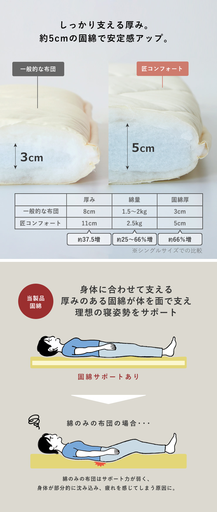 これらを防ぐ固綿は、一般的な敷き布団だと厚みが約3cm程度に対し、本製品は約5cmのしっかりとしたポリエステル固綿を採用。厚みのある芯材が体を面で支え、沈み込みすぎを防ぐことで、底つき感の少ない安定した寝心地・自然な寝姿勢を実現します。