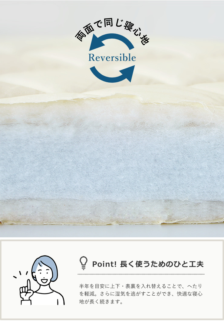 上下・表裏を入れ替えて使うことで、同じ面に負担が集中せず、へたりや偏りを軽減します。日々の使い方に合わせて使い分けることで、ふっくらとした寝心地が長く続き、より快適にお使いいただけます。