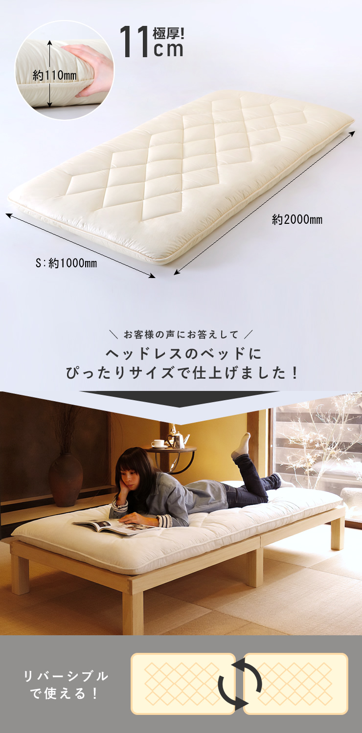 一般的な敷布団は長さ210cmが主流ですが、あえてベッドフレームに収まりのいいジャストサイズに仕上げました。 フレームからはみ出さず見た目もスッキリ整うのはもちろん、ベッドでも床置きでも場所を問わず暮らしに寄り添うサイズ設計です。