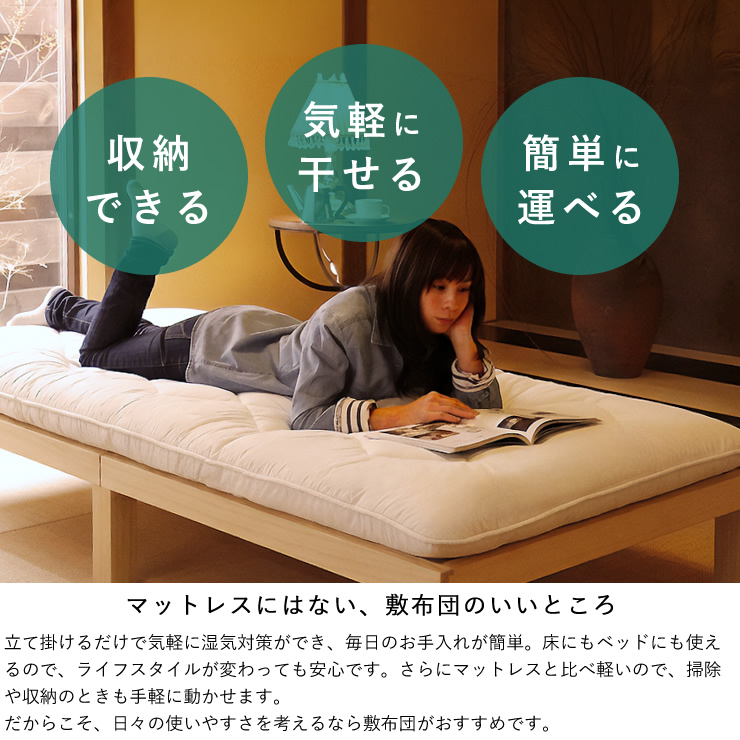 さらにマットレスと比べ軽いので、掃除や収納のときも手軽に動かせます。だからこそ、日々の使いやすさを考えるなら敷布団がおすすめです。