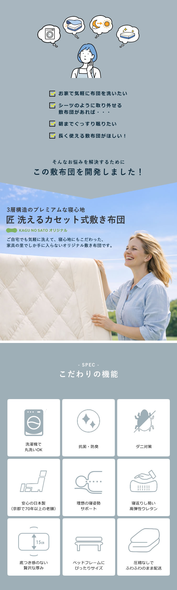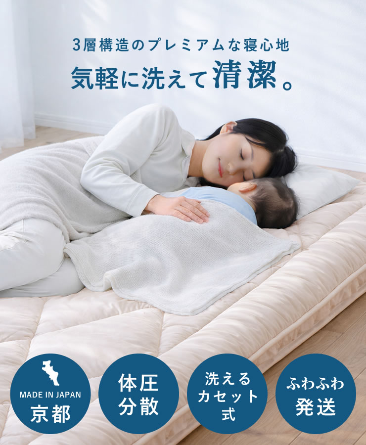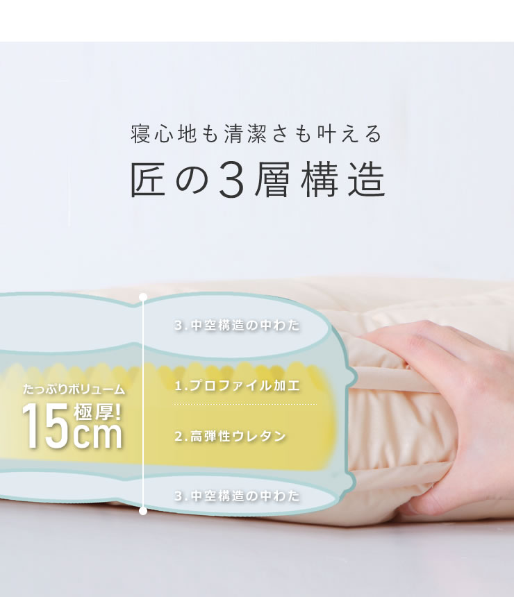 カセットカバーを外して中材ごと洗える仕様で、いつでも清潔にお使いいただけます。約15cmの厚みが体をしっかり支え、底つき感のない安定した寝心地を実現。快適さと清潔さを両立した、こだわりの3層構造です。