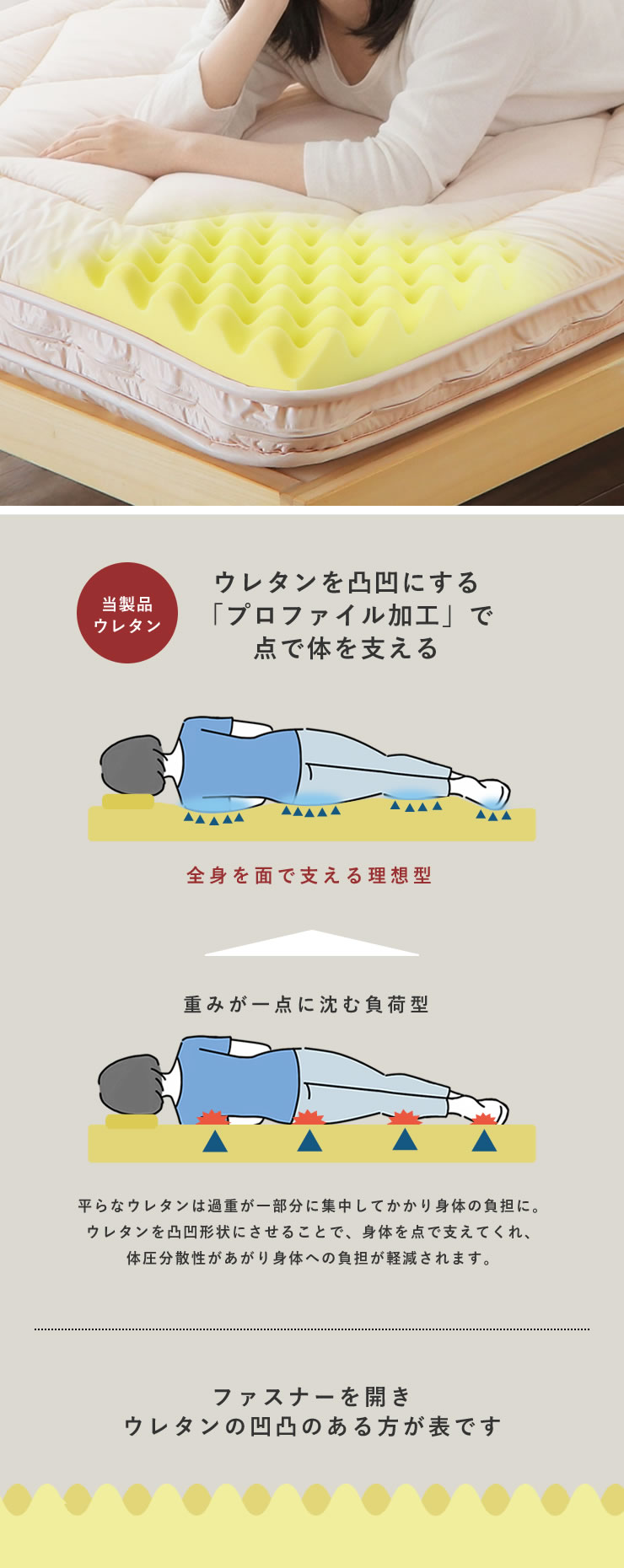 一般的なウレタンよりも密度が高く押し上げる力の強い「高弾性プロファイルウレタン」を採用することで、凸凹が身体を「点」で力強く支え、理想の寝姿勢をキープします。