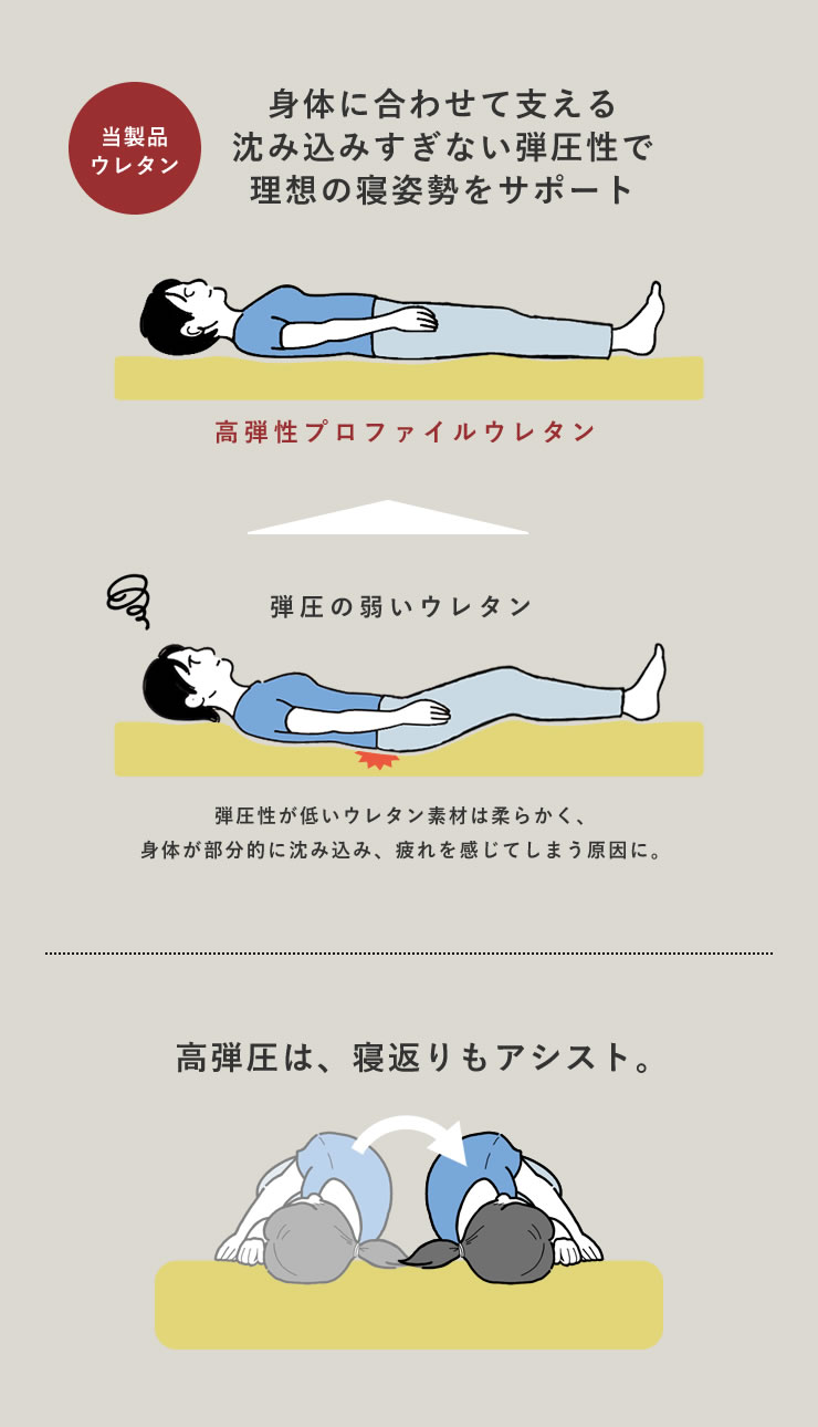 当製品の高弾性プロファイルウレタンは、押し戻す力が強く、弾む力を利用して身体全体を一直線に”もちっ”と支えてくれるので、「沈み込む」ではなく「浮かせて、整える」構造です。