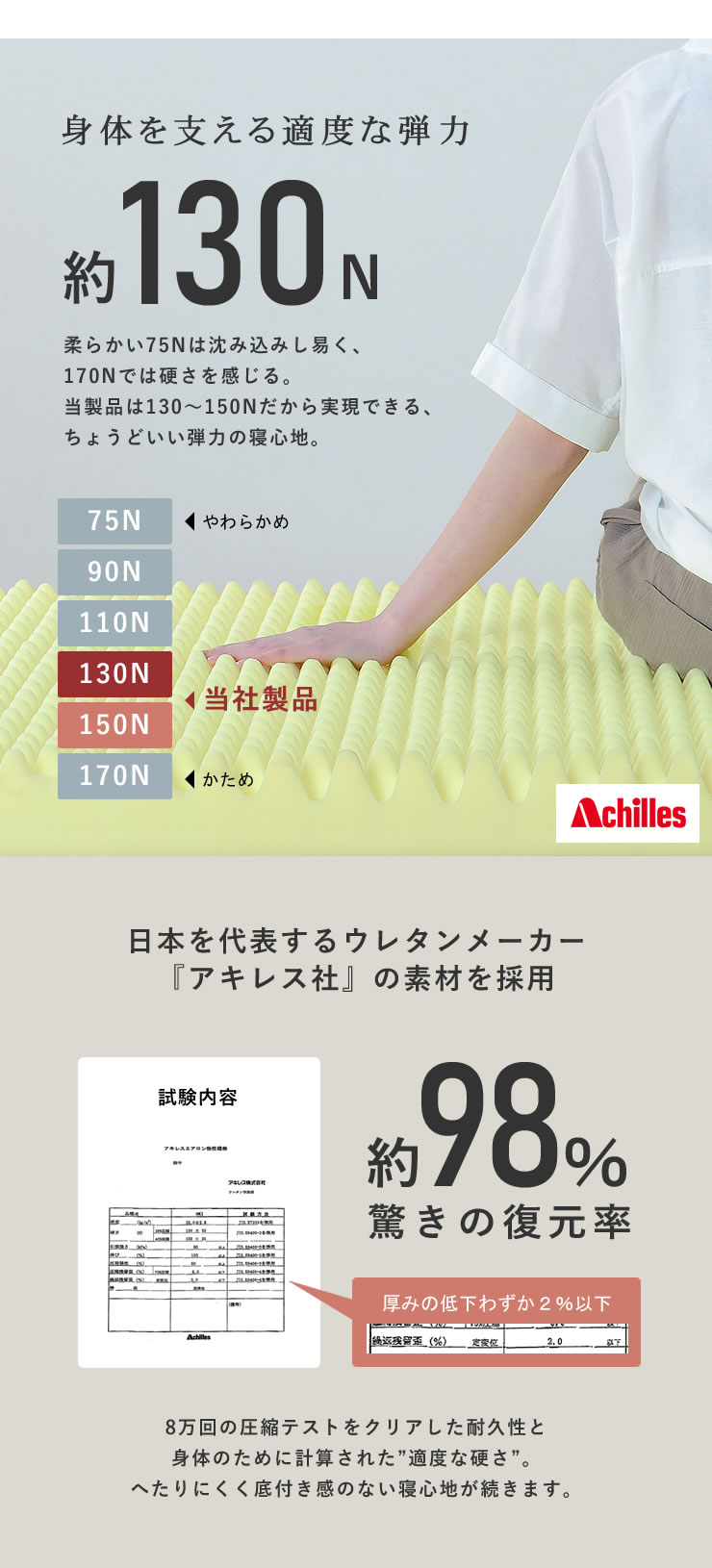また、身体を預けた瞬間にバネのような反発が働き、寝返りに必要な筋力を最小限に抑えるため、眠りを妨げることなくスムーズに体勢を変えられます。