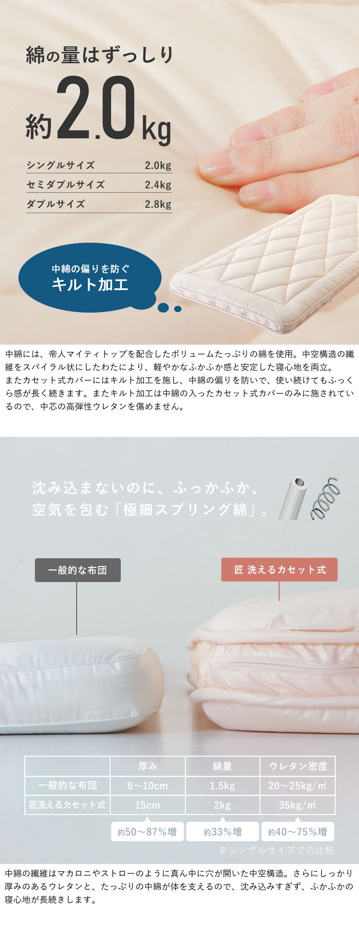 選りすぐりの厚みのある綿と高弾性構造により、体圧を分散し体をしっかりと支えつつ、包み込まれるような体感が感じられます。
