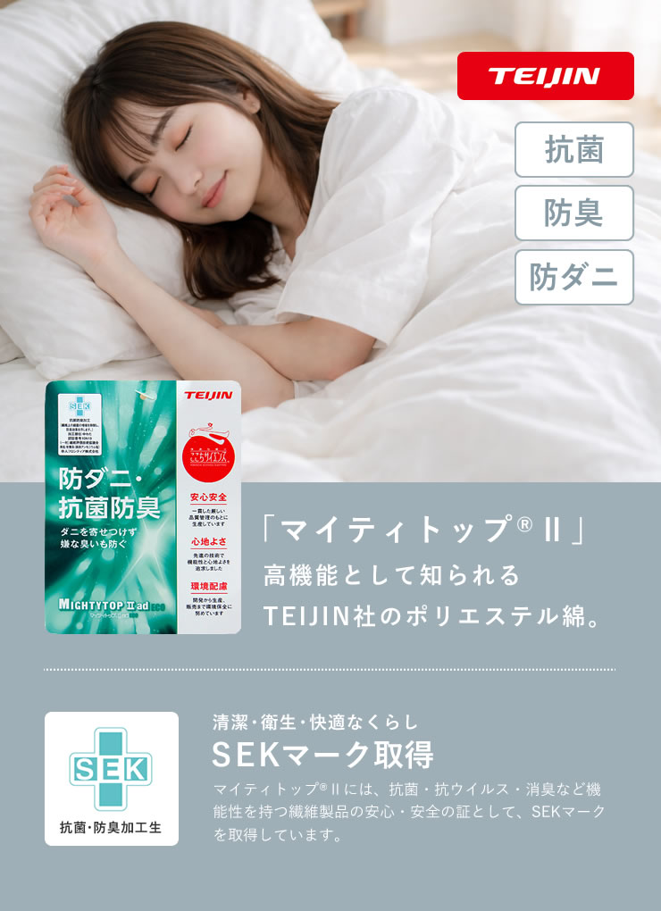 繊維そのものに抗菌・防臭・防ダニ機能を練り込んだ独自技術により、細菌の増殖を抑え、気になるニオイの発生も軽減。毎日使う寝具を、清潔で快適な状態に保ちます。