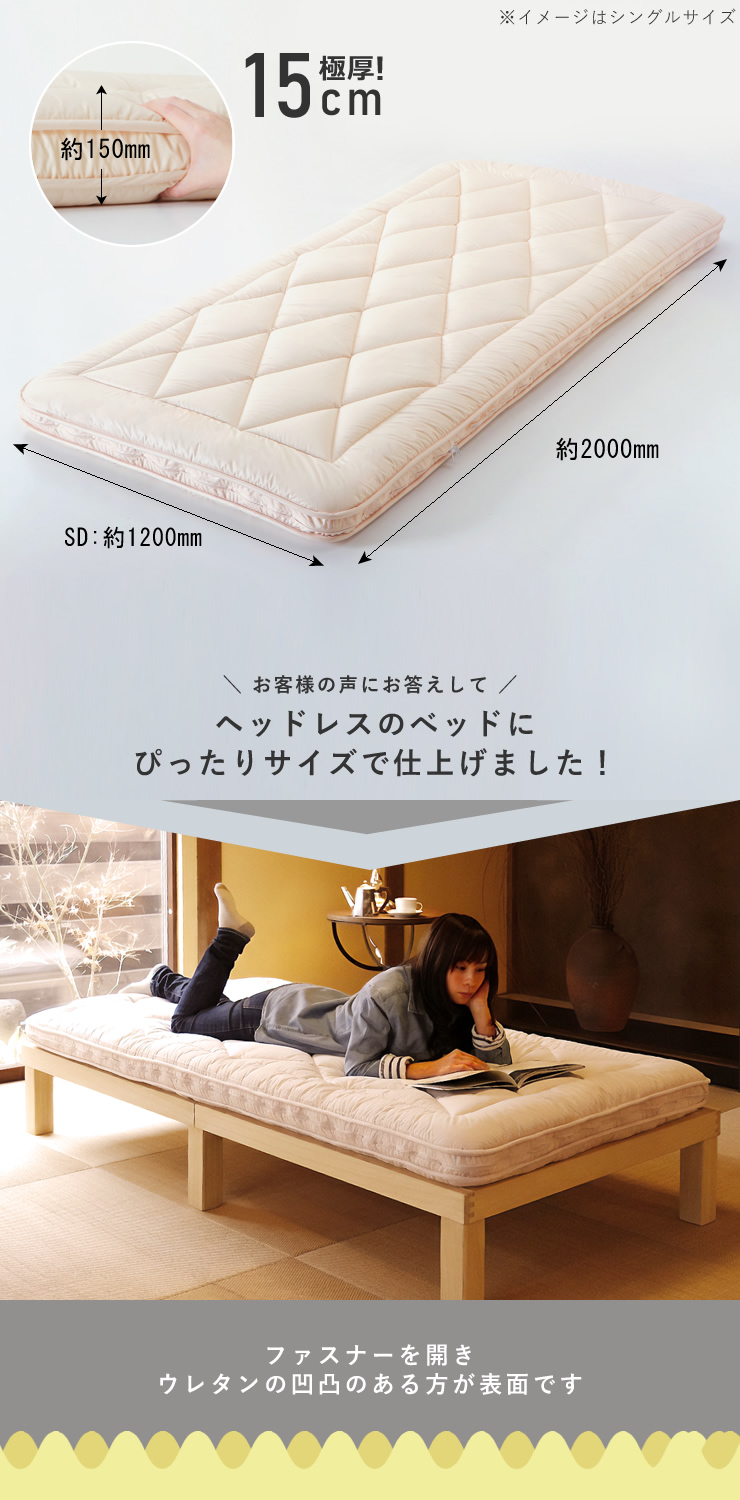 カセットカバーを外して中材ごと洗える仕様で、いつでも清潔にお使いいただけます。約15cmの厚みが体をしっかり支え、底つき感のない安定した寝心地を実現。快適さと清潔さを両立した、こだわりの3層構造です。