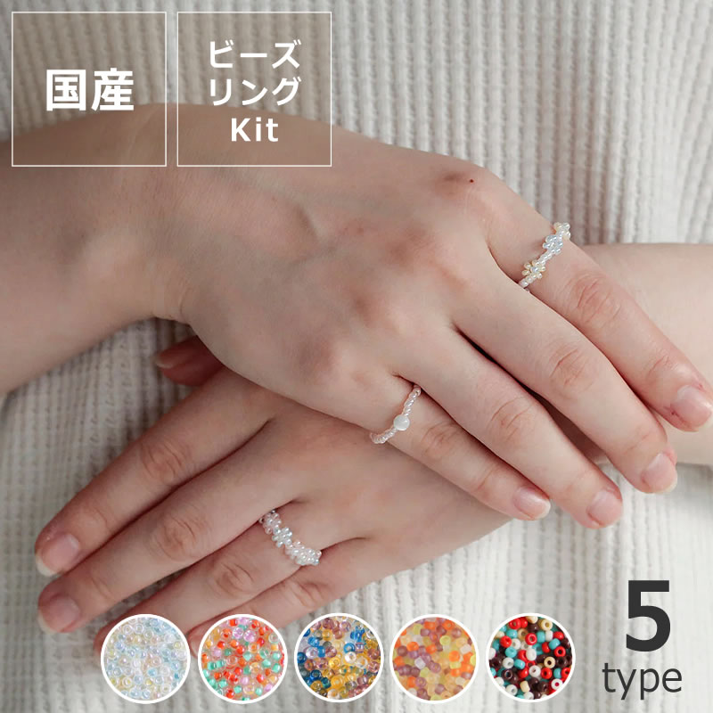 SNSで人気のカラーをセレクトした可愛いビーズリングのハンドメイドキットです。小さく繊細なグラスビーズを連ねて作るリングはキラキラと輝き、手元を明るく華やかに見せてくれます。5色のお好みのカラーから選んで自分だけのビーズリングを作ることができます。
