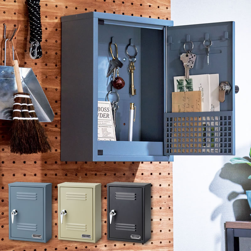ヴィンテージ感のあるロッカーをモチーフにデザインされた、置き掛け兼用の鍵収納ボックス。鍵の他にも、大切な印鑑・手帳・はがき・手紙・小物などを収納して施錠しておけるので、玄関やリビング、ご自分のお部屋に保管しておけます。