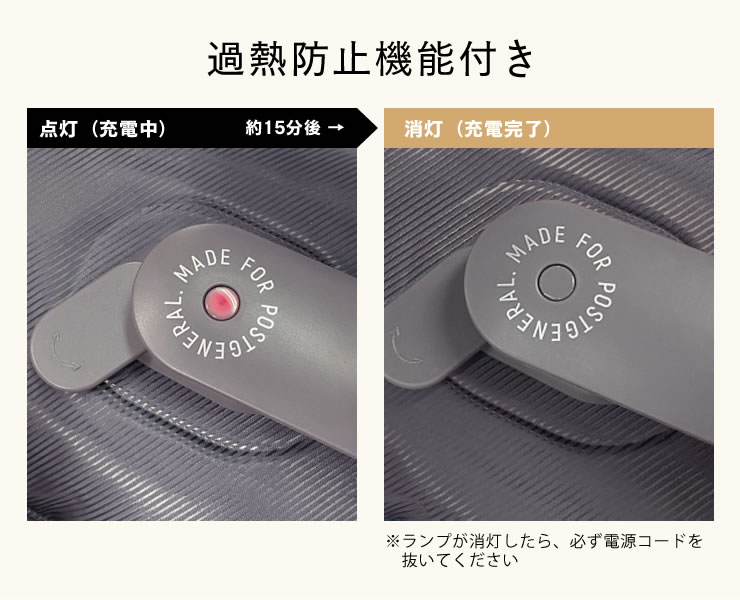 約15分の充電(蓄熱)が完了するとランプが消灯し、自動で通電を停止する、過熱防止機能付き。