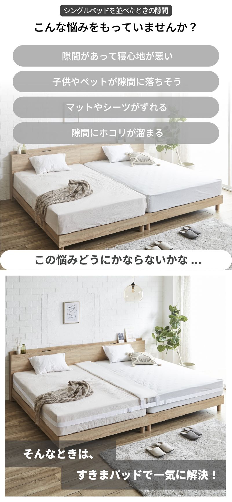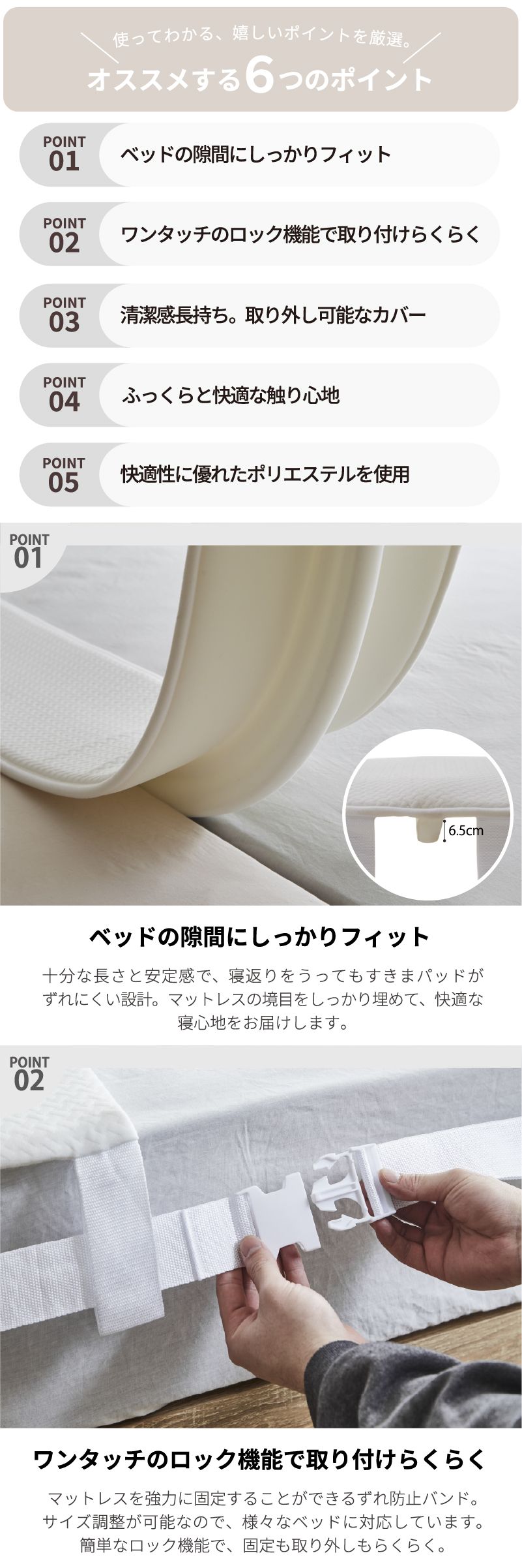| おすすめポイント | ■ベッドの隙間に差し込む長さは6.5cm。寝返りをうってもズレにくい仕様 ■固定用のバンドは、簡単なロック機能でらくらく ■ワイドな横幅30cmでベッド間の違和感を大幅に軽減 ■取り外し可能なカバー(手洗いOK) ■ウレタンフォームを使用しており、ふっくら快適な触感で快適な寝心地 ■カバーには、耐久性・速乾性に優れたポリエステル生地を使用 |