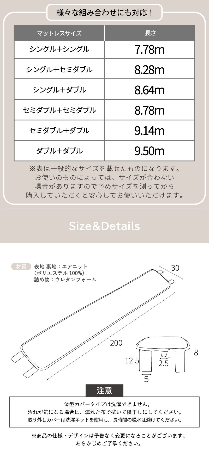 | サイズ | 商品:約 幅200×長さ30×厚み8cm 梱包:約 幅17×奥行17×高さ37cm |