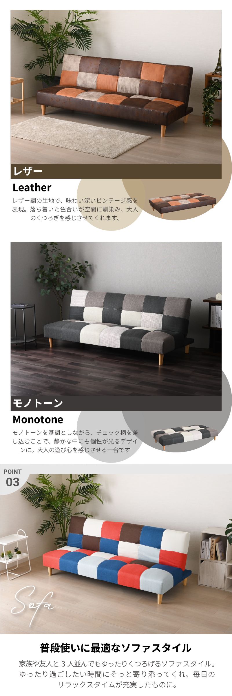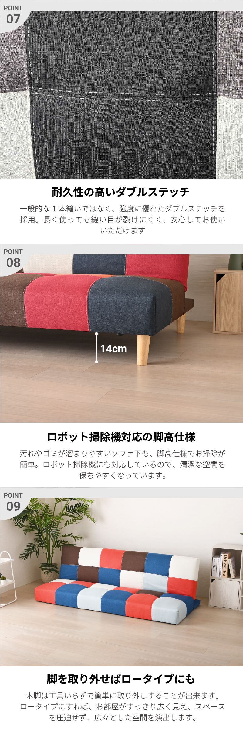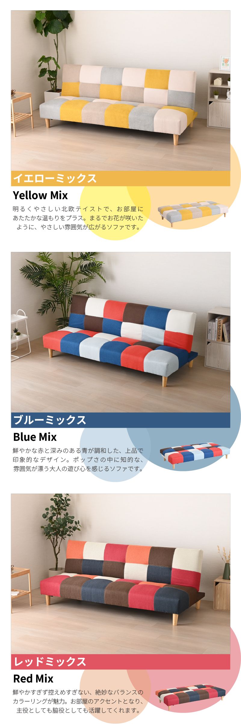 | おすすめポイント | ・シーンに合わせて使える3WAYスタイル ・ソファースタイル: 普段使いに最適な奥行き。ゆったりとくつろげます。 ・リクライニングスタイル: 背もたれは3段階のリクライニング機能付き。 ・ベッドスタイル: フラットに倒せば簡易ベッドに早変わり。急な来客時にも慌てません。 ・ロボット掃除機対応の脚高14cm 高さ約14cmの天然木脚なので、 どんな空間にも自然と馴染み、心地よく寄り添ってくれるそんな一台です。 ・ロータイプにも変更可能 脚を取り外せば、ローソファーとして使用可能。 お部屋に圧迫感を与えず、こたつとの相性も抜群です。 ・耐久性の高いダブルステッチ 汚れやゴミが溜まりやすいソファ下も、脚高仕様でお掃除が簡単。 ロボット掃除機にも対応しているので、清潔な空間を保ちやすくなっています。 ・脚を外せばロータイプにも 座面は長期間の使用でも裂けづらいよう、ダブルステッチ(二重縫い)を採用。 ロータイプにすれば、お部屋がすっきり広く見え、スペースを圧迫せず、広々とした空間を演出します。 ・耐久性の高いダブルステッチ 一般的な1本縫いではなく、強度に優れたダブルステッチを採用。 見た目のお洒落さだけでなく、耐久性も考慮した設計です。 ・安心の座り心地 クッション材には、しっかりとした弾力性のSバネとウレタンフォームを使用。 長時間座っても疲れにくく、快適な座り心地を実現しました。 豊富な5色なカラーラインナップ ・BLMIX (ブルーミックス): ポップで元気な印象。お部屋のアクセントに最適。 ・YEMIX (イエローミックス): 明るく優しい北欧テイスト。リビングを華やかに彩ります。 ・REDMIX (レッドミックス): 暖色系の組み合わせで、レトロで温かみのある空間に。 ・MONOTONE (モノトーン): どんなお部屋にも馴染みやすいシックな配色。ワンポイントのチェック柄が可愛らしいデザイン。 ・DBR (ダークブラウン): ヴィンテージ感のあるお洒落なレザー調ファブリック。落ち着いた大人空間を演出。 |