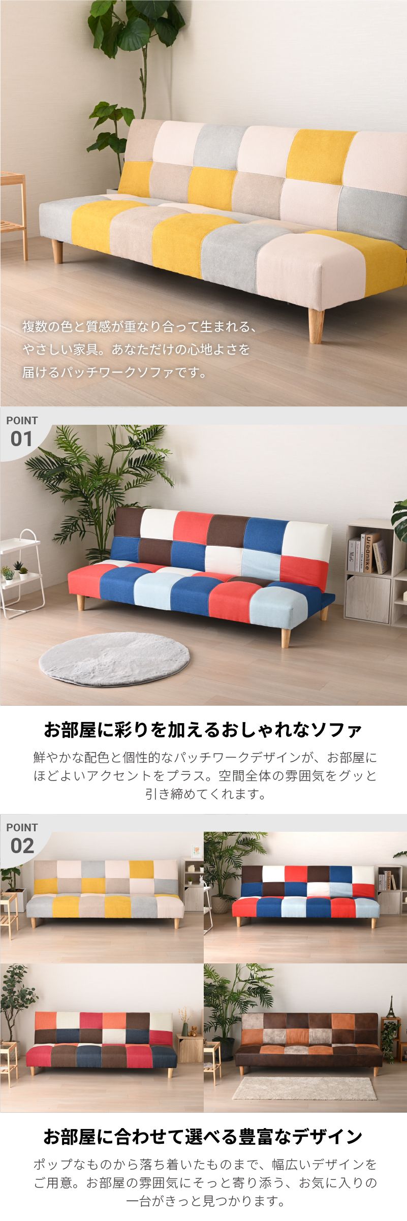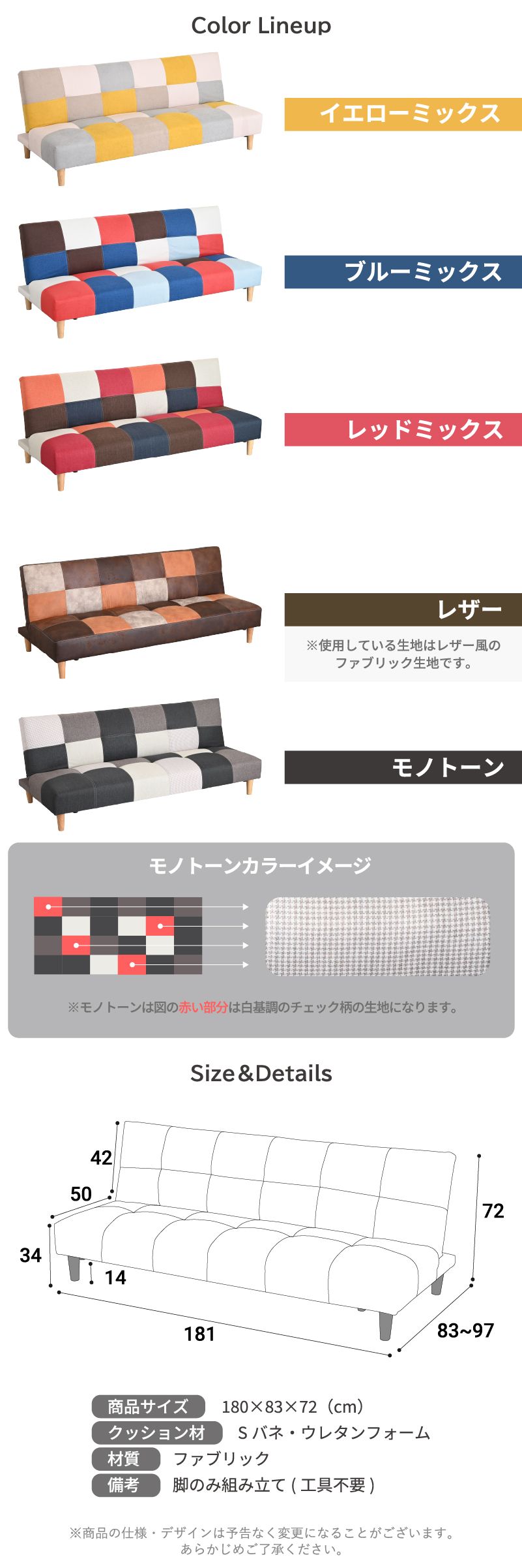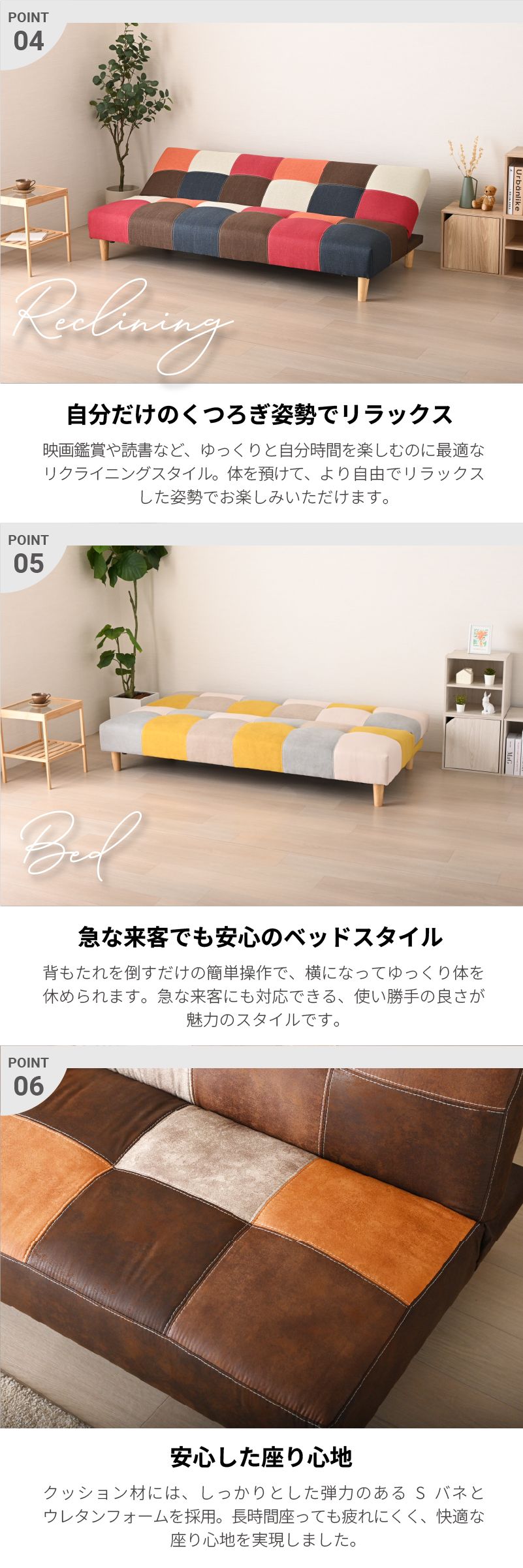 | おすすめポイント | ・シーンに合わせて使える3WAYスタイル ・ソファースタイル: 普段使いに最適な奥行き。ゆったりとくつろげます。 ・リクライニングスタイル: 背もたれは3段階のリクライニング機能付き。 ・ベッドスタイル: フラットに倒せば簡易ベッドに早変わり。急な来客時にも慌てません。 ・ロボット掃除機対応の脚高14cm 高さ約14cmの天然木脚なので、 どんな空間にも自然と馴染み、心地よく寄り添ってくれるそんな一台です。 ・ロータイプにも変更可能 脚を取り外せば、ローソファーとして使用可能。 お部屋に圧迫感を与えず、こたつとの相性も抜群です。 ・耐久性の高いダブルステッチ 汚れやゴミが溜まりやすいソファ下も、脚高仕様でお掃除が簡単。 ロボット掃除機にも対応しているので、清潔な空間を保ちやすくなっています。 ・脚を外せばロータイプにも 座面は長期間の使用でも裂けづらいよう、ダブルステッチ(二重縫い)を採用。 ロータイプにすれば、お部屋がすっきり広く見え、スペースを圧迫せず、広々とした空間を演出します。 ・耐久性の高いダブルステッチ 一般的な1本縫いではなく、強度に優れたダブルステッチを採用。 見た目のお洒落さだけでなく、耐久性も考慮した設計です。 ・安心の座り心地 クッション材には、しっかりとした弾力性のSバネとウレタンフォームを使用。 長時間座っても疲れにくく、快適な座り心地を実現しました。 豊富な5色なカラーラインナップ ・BLMIX (ブルーミックス): ポップで元気な印象。お部屋のアクセントに最適。 ・YEMIX (イエローミックス): 明るく優しい北欧テイスト。リビングを華やかに彩ります。 ・REDMIX (レッドミックス): 暖色系の組み合わせで、レトロで温かみのある空間に。 ・MONOTONE (モノトーン): どんなお部屋にも馴染みやすいシックな配色。ワンポイントのチェック柄が可愛らしいデザイン。 ・DBR (ダークブラウン): ヴィンテージ感のあるお洒落なレザー調ファブリック。落ち着いた大人空間を演出。 |