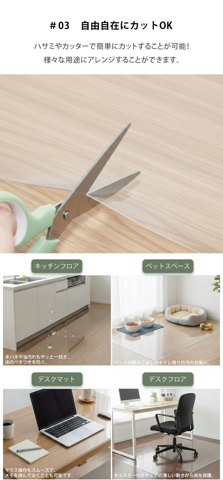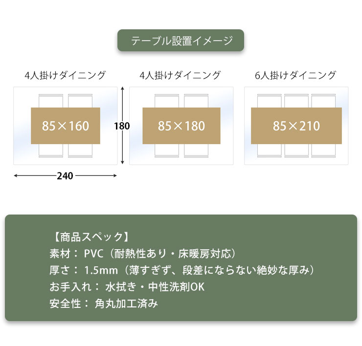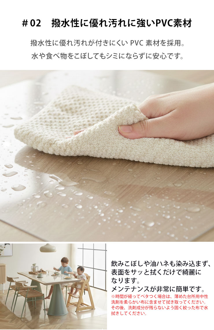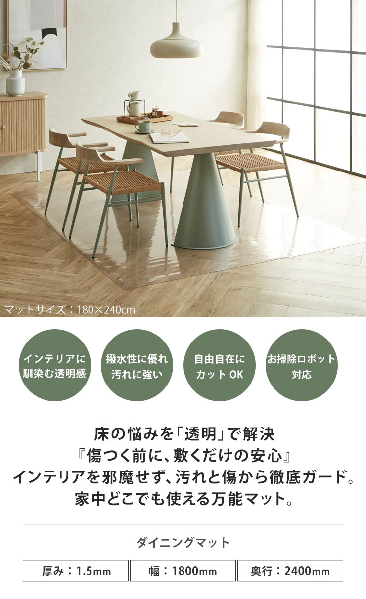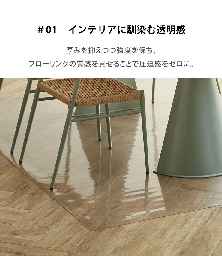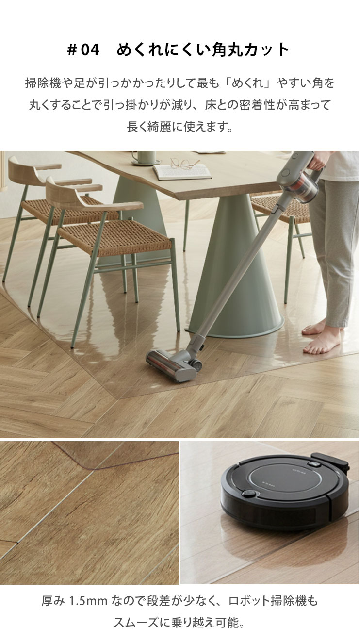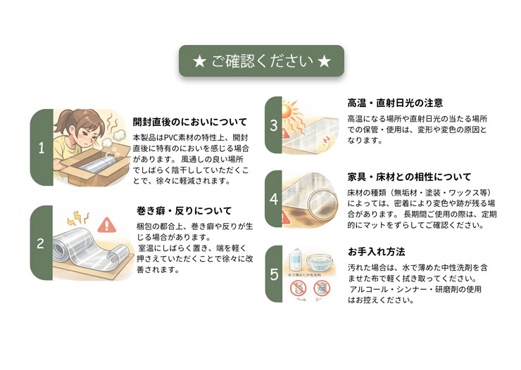 床材の種類(無垢材・塗装・ワックス等)によっては、密着により変色や跡が残る場合があります。長期間にご使用の際は、定期的にマットをずらしてご確認下さい。