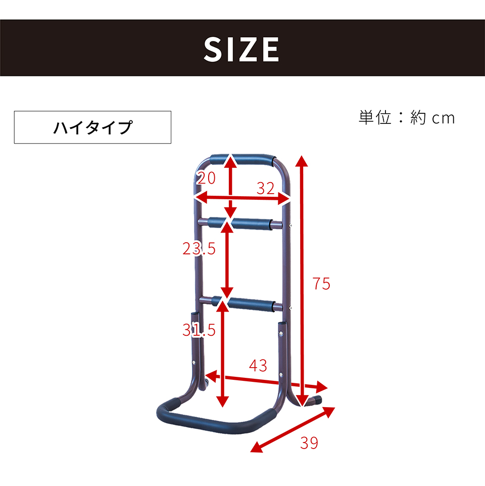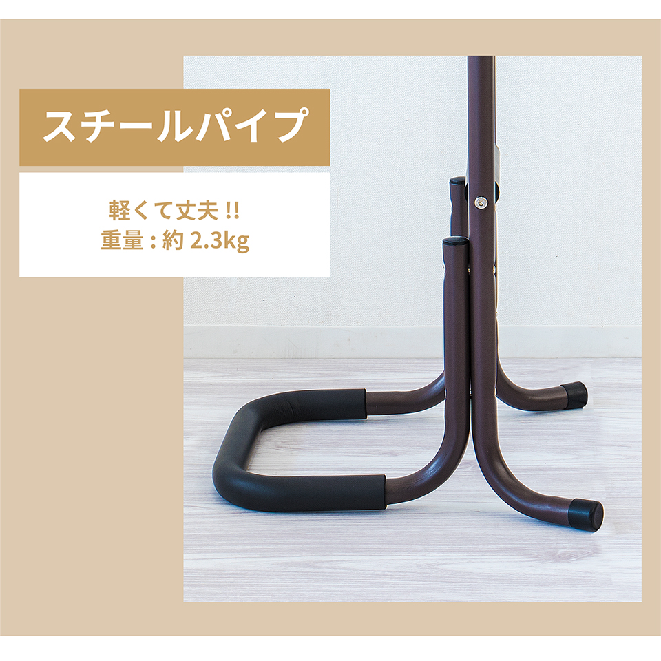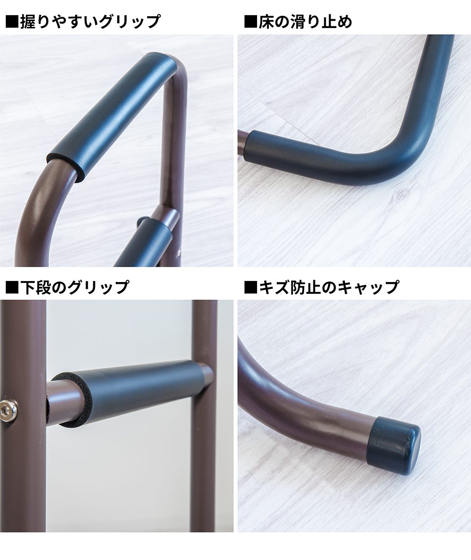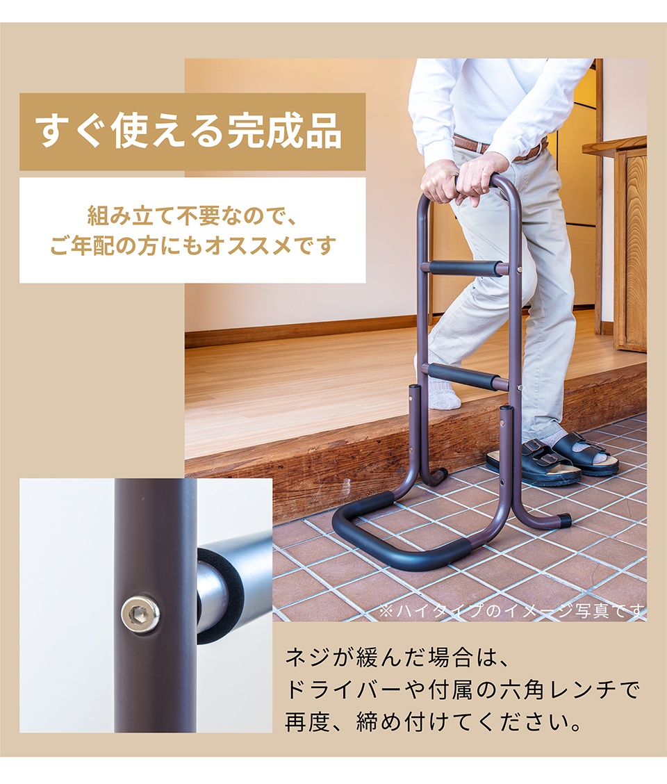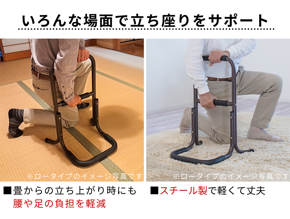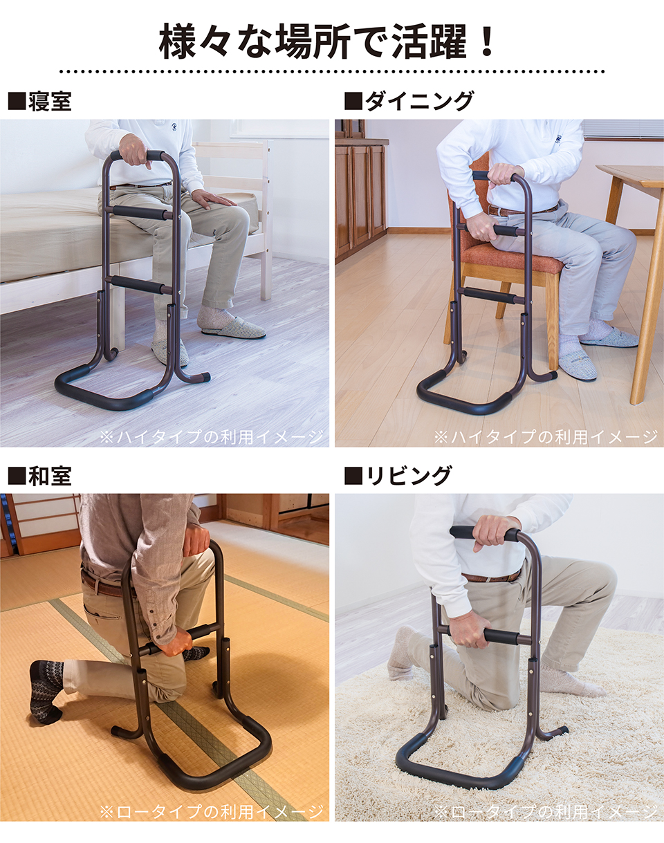 | 座った状態から立ち上がる際に足腰の負担を軽減できるサポートスタンドです。立ち上がり補助 サポートスタンド3段の特徴。座った状態から立ち上がるときにつかんで体重をかけられる、立ち上がりサポート用の移動式手すりです。手すり部分にはやわらかなクッションが巻かれており、しっかり握り込みやすくなっています。体重を預けてもしっかり支えてくれる丈夫な土台を採用しております。椅子やトイレ等のそばに置いて使用すれば、つらい立ち上がりがぐっと楽になります。そのほかにもベッドから立ち上がる時、玄関口の段差を上がる時など、様々な場所で活躍します。重量は2.32kgと比較的軽量なため移動もラクラク。身長など体型や使用場所に応じて2タイプご用意しています。 |