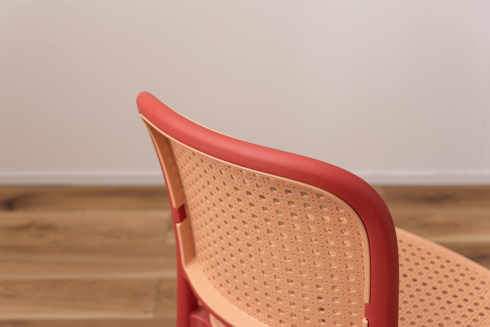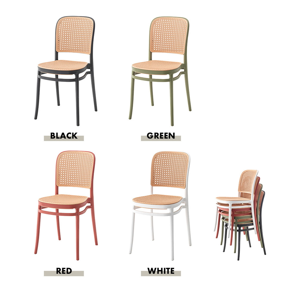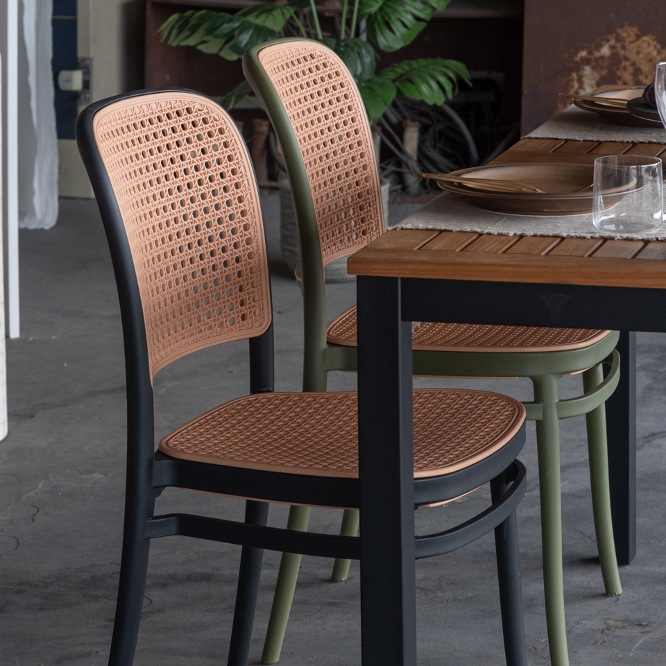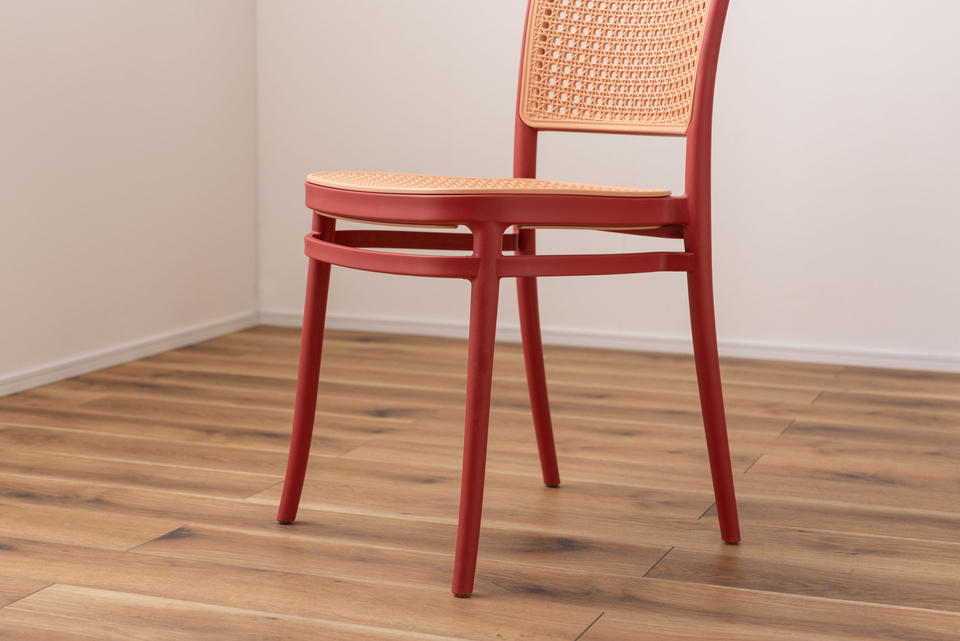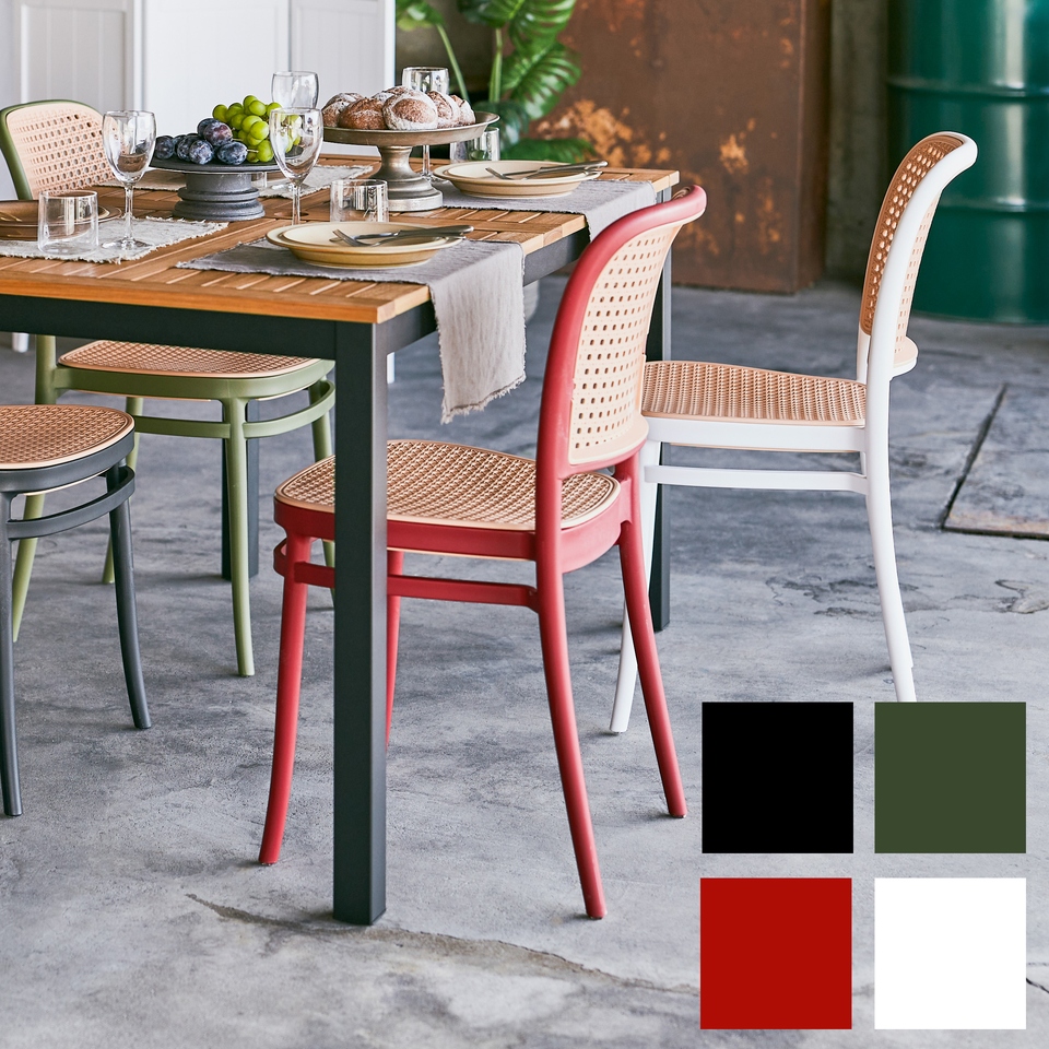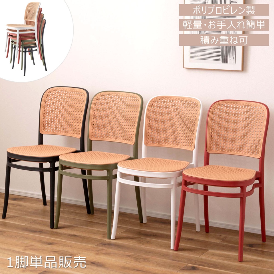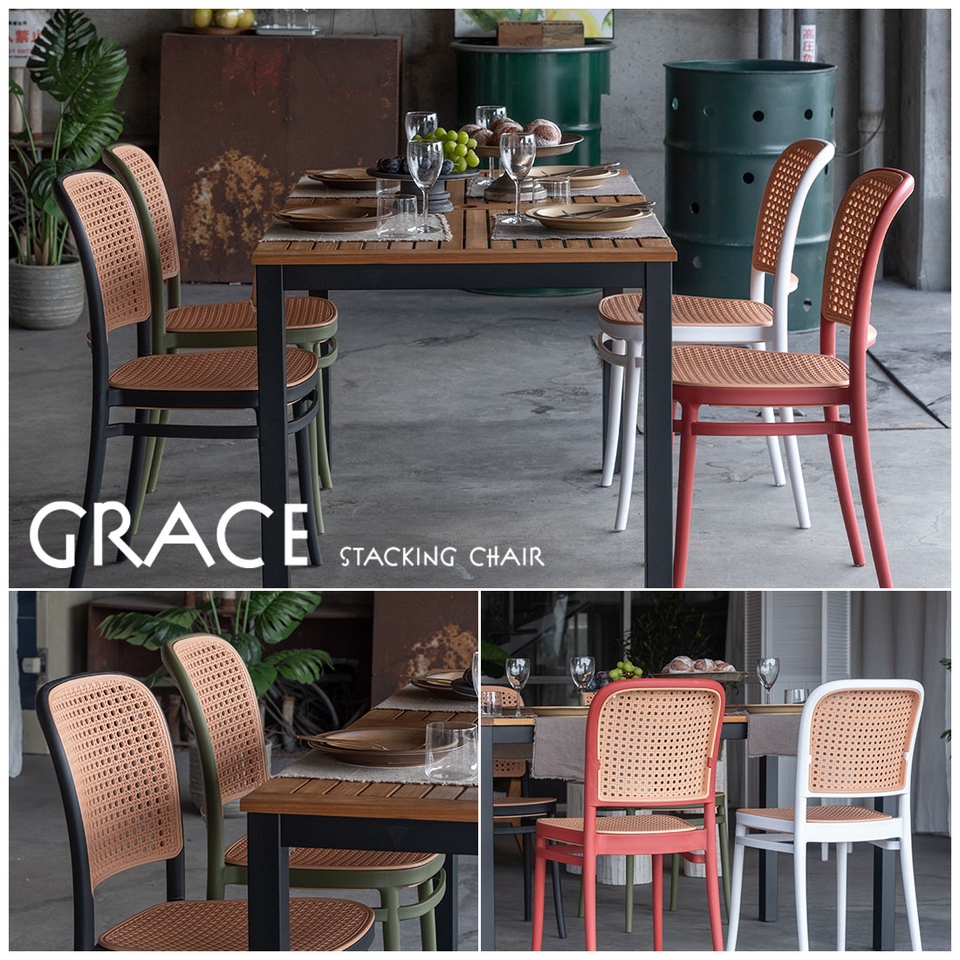 | 背面と座面にラタン調のデザインを施した、トレンド感溢れるグレイスチェア。ポリプロピレン製なので軽量で耐久性があり、傷や汚れに強いのも嬉しいポイント。どのカラーも落ち着いた合わせやすい色味をチョイスしており、お部屋ではもちろん、ガーデンシーンにもよく馴染むデザインです。スタッキング可能なので場所を取らずに収納することが出来ます。 |
