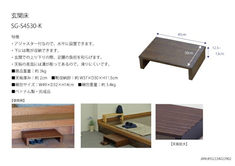 | ●アジャスター付なので、水平に設置できます。●下には靴が収納可能です。●玄関での上り下りの際、足腰の負担を和らげます。●天板の表面には溝が彫ってあるので滑りにくいです。●天板厚み:約2cm●靴収納部:約W37×D30×H11cm |