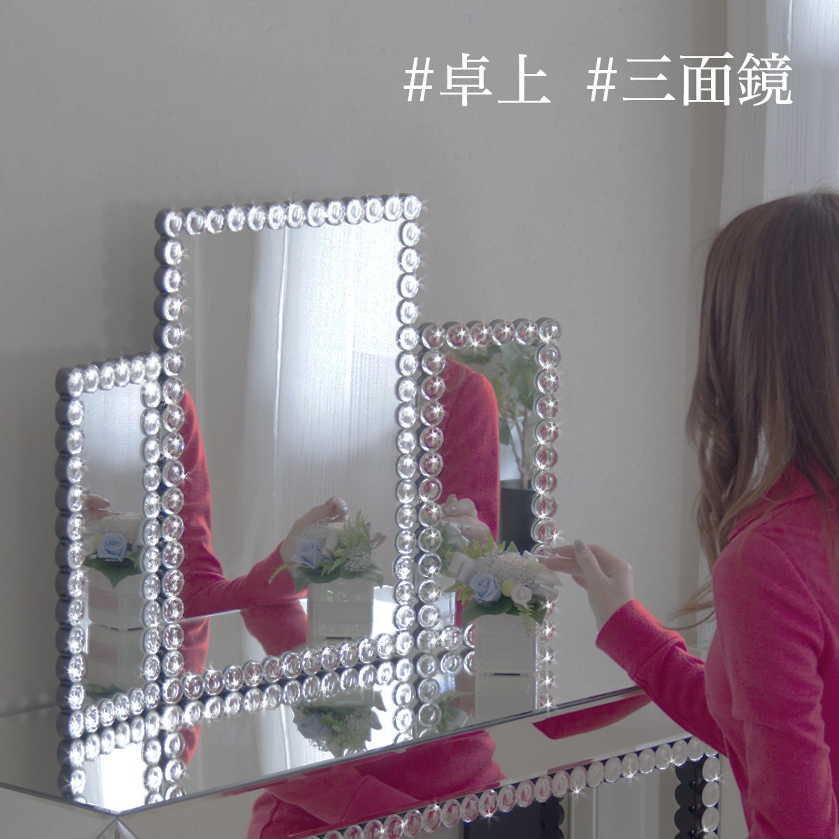 | クリスタル調の装飾が豪華。三面鏡はさまざまな角度からの身だしなみチェックに便利。 |