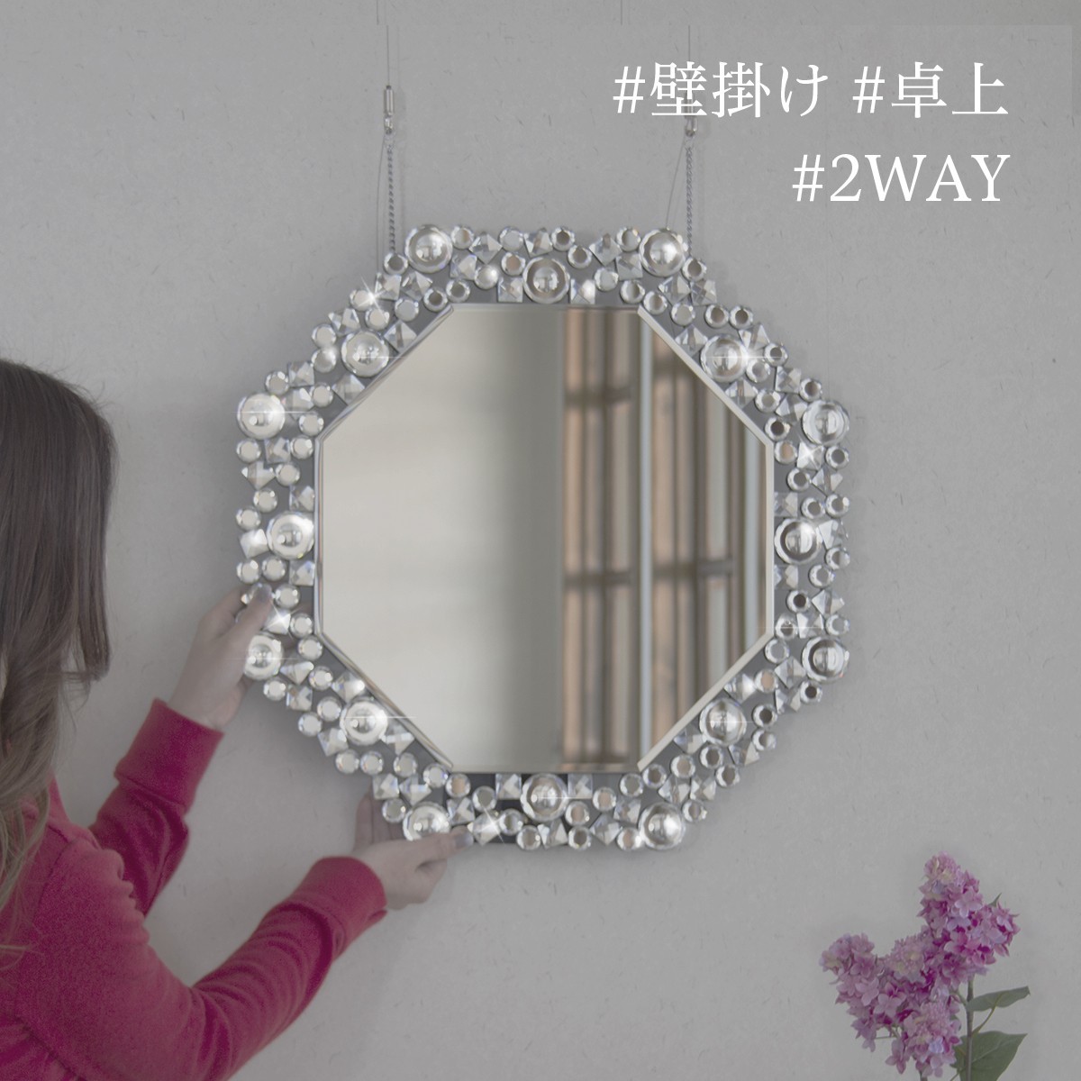 | 上品な印象の円形と、風水で縁起が良いとされる八角形、クリスタル調の装飾が豪華です。 卓上・壁掛け、どちらでもお使いいただけます。実用性はもちろん、インテリアとしても素敵です。 ロイヤルモダンミラーはデザイン性を重視しているため、飛散防止にはなっておりません。 衝撃により割れる可能性がございますので、十分ご注意してお取り扱いください。 |