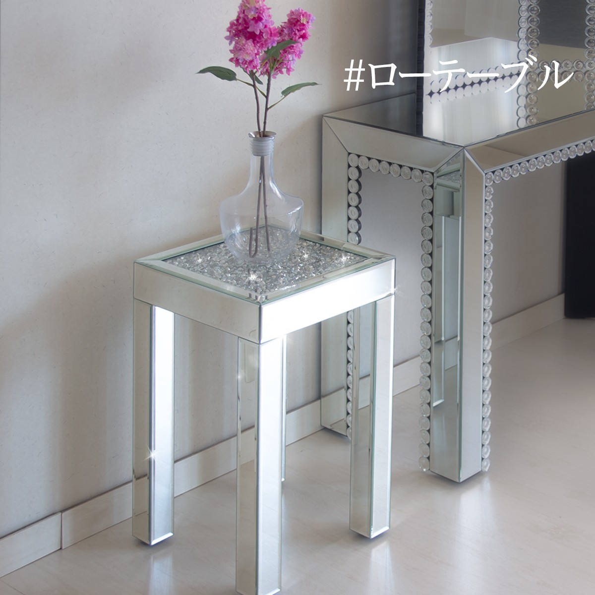 | ダイヤテーブル ロータイプ お部屋に置くだけで空間が華やかになります。 玄関の花台、リビングや寝室のサイドテーブルなど、さまざまな場所でお使いいただけます。 高級感のある空間に 上品で豪華なデザインガラステーブル Royal Modern Mirror Table ロイヤルモダン ミラーテーブル diamond table -low- まるで、ダイヤモンドが散りばめられたテーブル。 ガラス天板の中に、ダイヤモンドのようにデザインカットされたガラスが、無数に散りばめられたサイドテーブル。このテーブルひとつでお部屋が華やかになります。 究極のインテリア。 一度見たら忘れられないダイヤテーブル。デスクサイドにもう一つ置きたいコンパクトなサイドテーブルです。花瓶をそっと置くだけでエレガントな雰囲気に。 複雑に反射する光。 一粒一粒のガラスがダイヤモンドのように輝く。 煌びやかで豪華なミニテーブルです。 存在感のある重厚な鏡台。 シリーズでそろえるとさらに輝きが増します。 割れ物だから、大事にしたい。 ロイヤルモダンミラーはデザイン性を重視しているため、飛散防止にはなっておりません。 衝撃により割れる可能性がございますので、十分ご注意してお取り扱いください。 脚底には、床の傷付き防止の樹脂キャップが付きます。 |