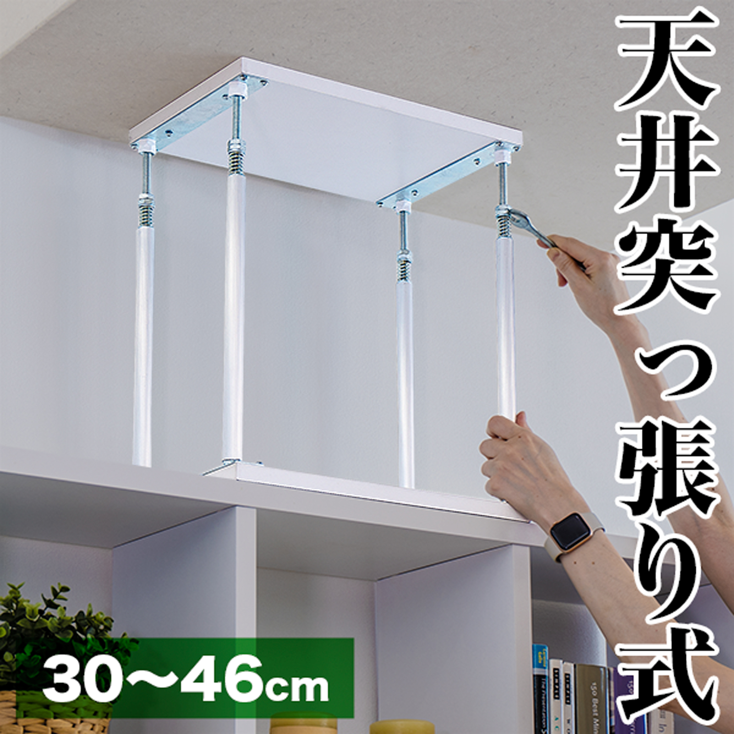 | 本棚やラックの天井との空間に突っ張ることで、地震対策として、間仕切り家具を安定させる器具として、それらの家具を固定します。特に当店で販売中のスクエアラックには最適な天井突っ張り器です。突っ張り棒の中心とスクエアラックの縦の仕切り板の中心が同じライン上に重なり、安定感があります。 |