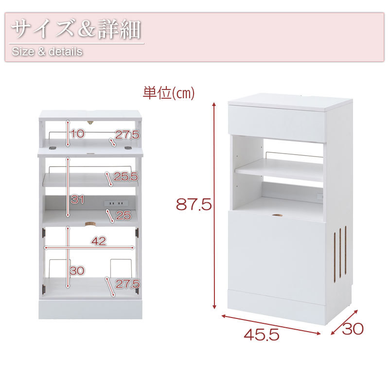 ■商品サイズ:(約)幅45.5×奥行30×高さ87.5cm、フラップ扉内寸:(約)幅42×奥行27.5×高さ10cm、オープン部内寸:(約)幅42×奥行25×高さ31cm、取り外し可能扉内寸:(約)幅42×奥行27.5×高さ30cm