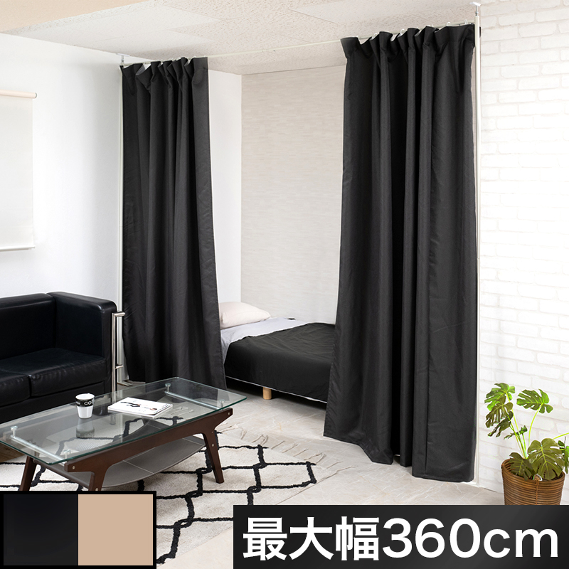 | ■商品について/突っ張り式で簡易に間仕切れるカーテンタイプ。天井近くまで隠せるので完全個室感のある仕上がり。ストレートタイプの幅伸縮式とコーナータイプの展開でセットで並べてクローゼット空間を造ったり、コーナータイプのみでブティックの試着室のような使い方もできます。カーテンは取り外し可能で手持ちのカーテンに付け替えも可能。しっかりとした生地のカーテンカラーはベージュとグレー混のブラックの2色から。邪魔にならない省スペース設計で使いまわしも簡単。 |